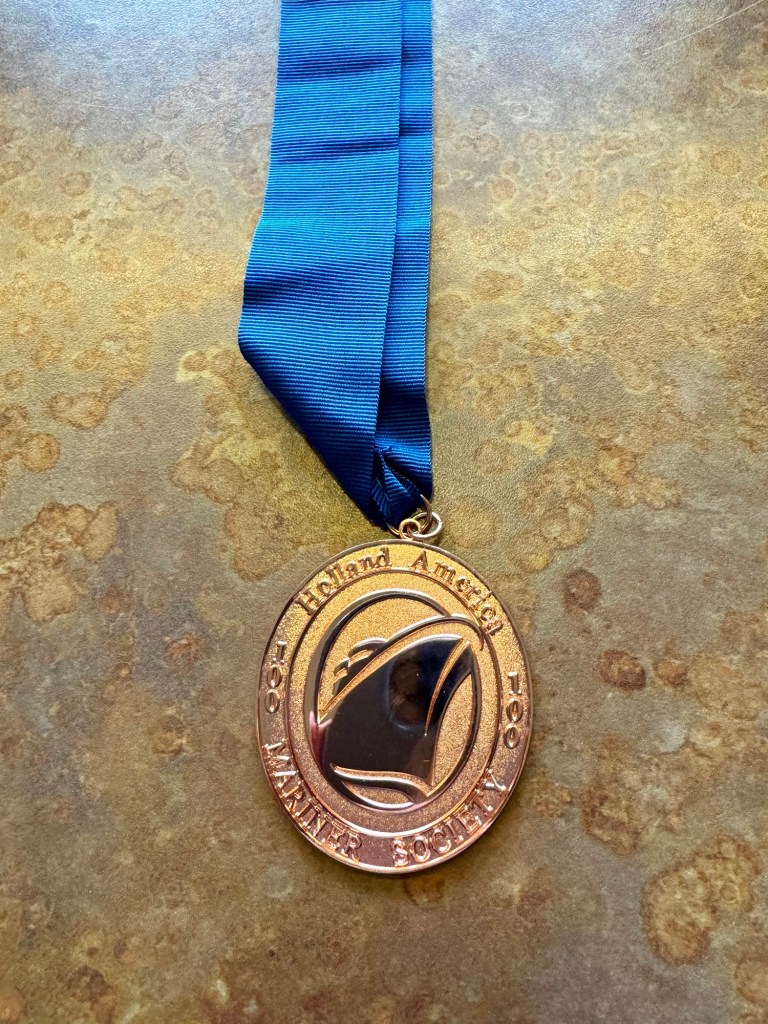 PS: Today’s bonus picture is the Medallion Kathy got for becoming a 4 Star Mariner on this cruise line. It may not be fancy but it gets us free laundry every day!