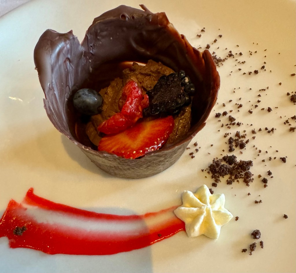 Tonight was dressy night so we got all gussied up for dinner. We got some nice pictures of all of us. For dinner we both had the Slab Salad for starters and Kathy had the FOS (I stopped spelling it out!) and I had the Chilled Smoked Chicken. For our Mains, Kathy had the Beef Tenderloin and I had the Black Cod. For dessert, Kathy had the Brownie Peanut Sundae and I had the Chocolate Cup (still celebrating World Chocolate Day!).