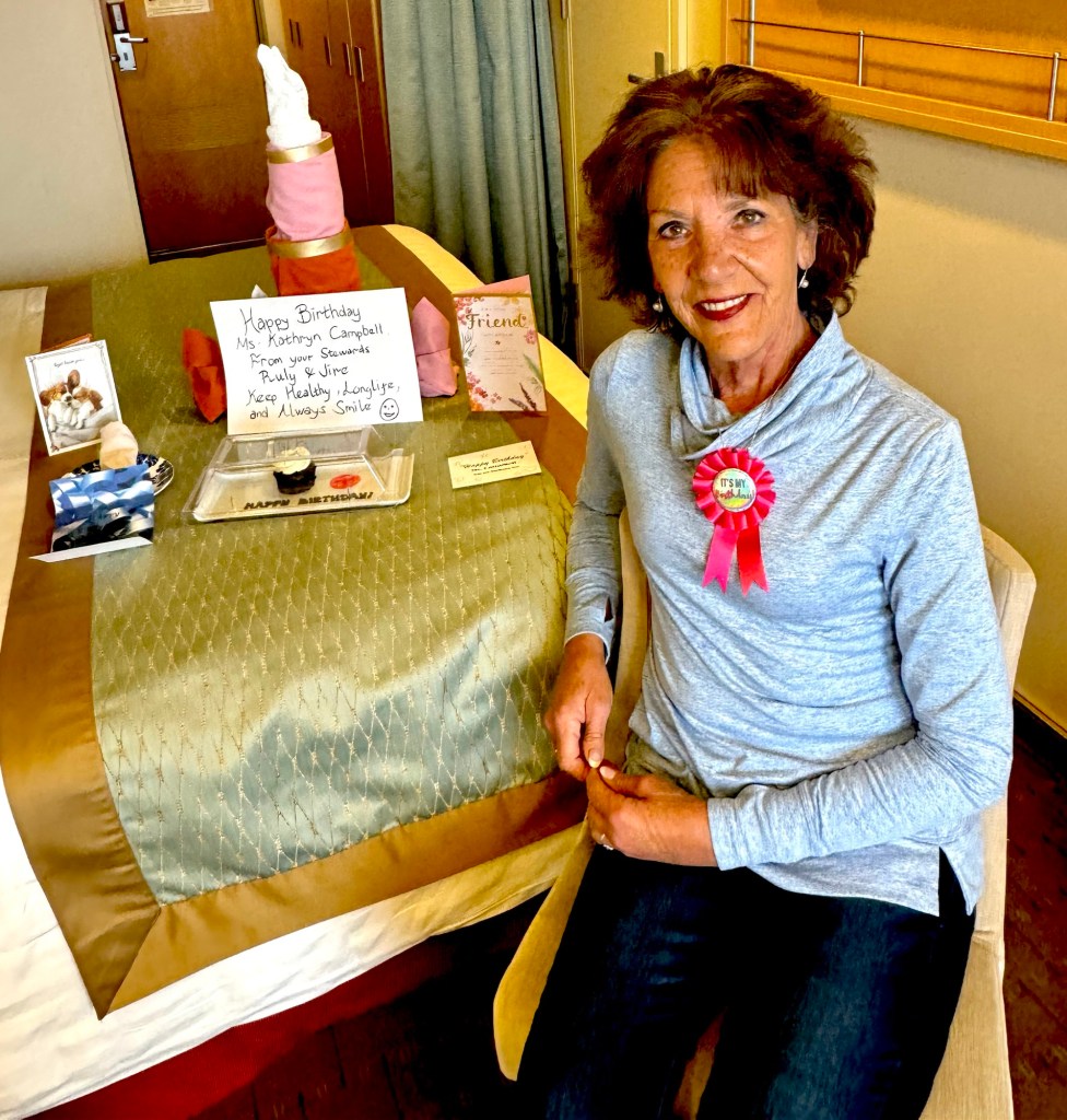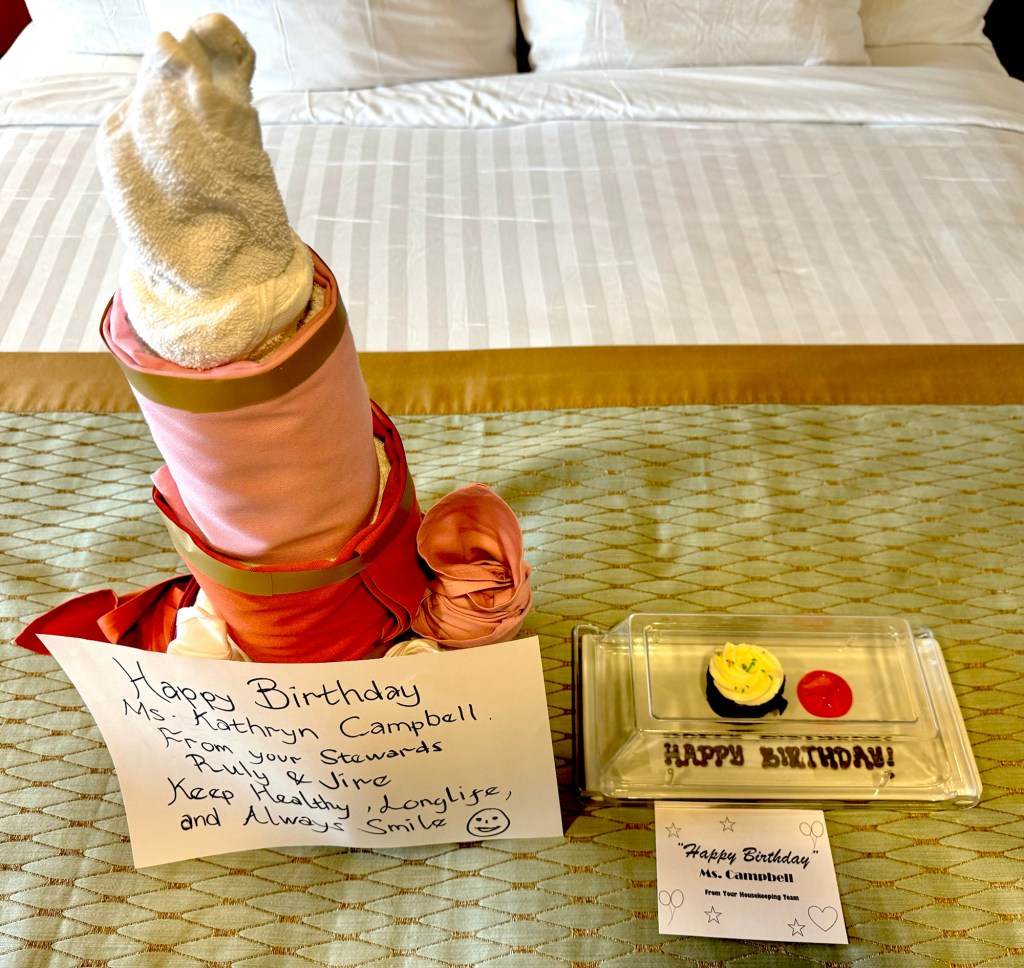 Then we came back to the ship for lunch and when we got back to our room, our room stewards had decorated the room for Kathy’s birthday with a sign and a cupcake! That was really special!