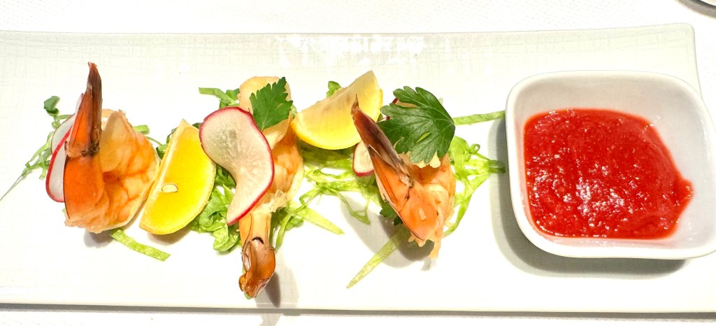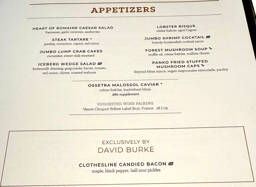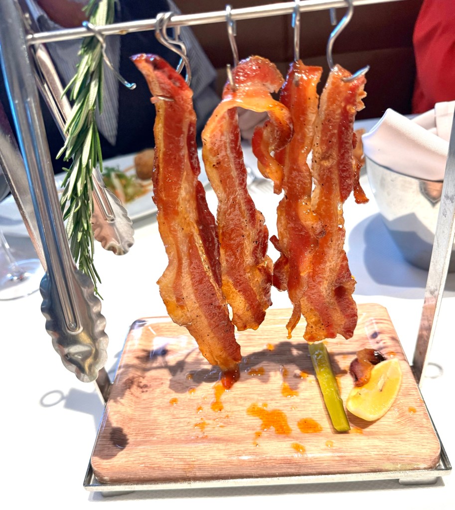 For dinner, Kathy and I both got the Jumbo Shrimp Cocktail for an appetizer and we all shared the Clothesline Candied Bacon (dang was that good!). For our mains, Kathy got the Beef Tenderloin with Lobster Dumplings and I had the Boneless Ribeye with two Sea Scallops. For dessert, Kathy had the Creme Brûlée and I had the Chocolate Soufflé. They even brought Kathy a Birthday Cake but we were all so stuffed we just took it back to the room. All the food was fabulous!