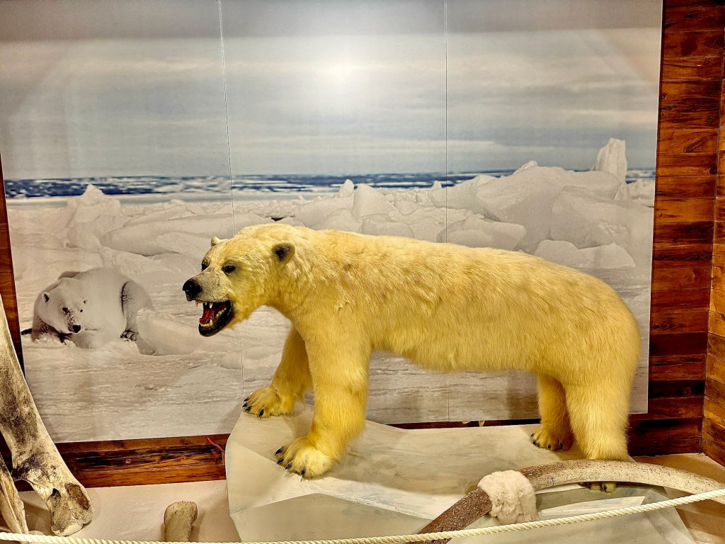 We slept in a little, had breakfast, then got off around 10:30 AM. We had to take a tender boat in since the town is so small it can’t handle cruise ships at its dock. Once on land we took their Hop On Hop Off bus around the island. We went to a place called Fishing Point Municipal Park. They had a lighthouse, gift shop and a great view over the bay. They said you sometimes can see whales from there but we didn’t see any. But we did see a polar bear! But it was a stuffed one in the gift shop!