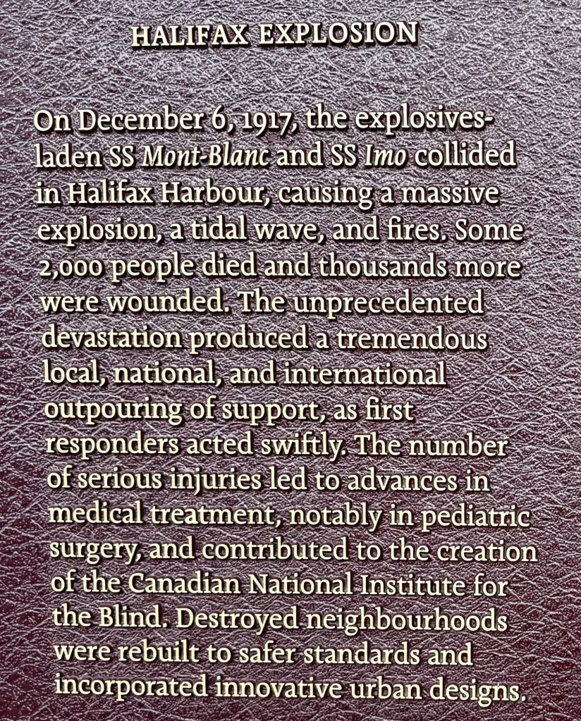 Then our last stop was to a memorial to the Halifax explosion which occurred on Dec 6, 1917 and pretty much changed the city due to all the devastation it caused. It was caused by the collision of two ships in the harbor carrying explosives. When they hit, the explosives went off and glass shattered over 200 miles away. Over 2,000 people died and over 9,000 were injured. But there were two interesting stories that came out of it.