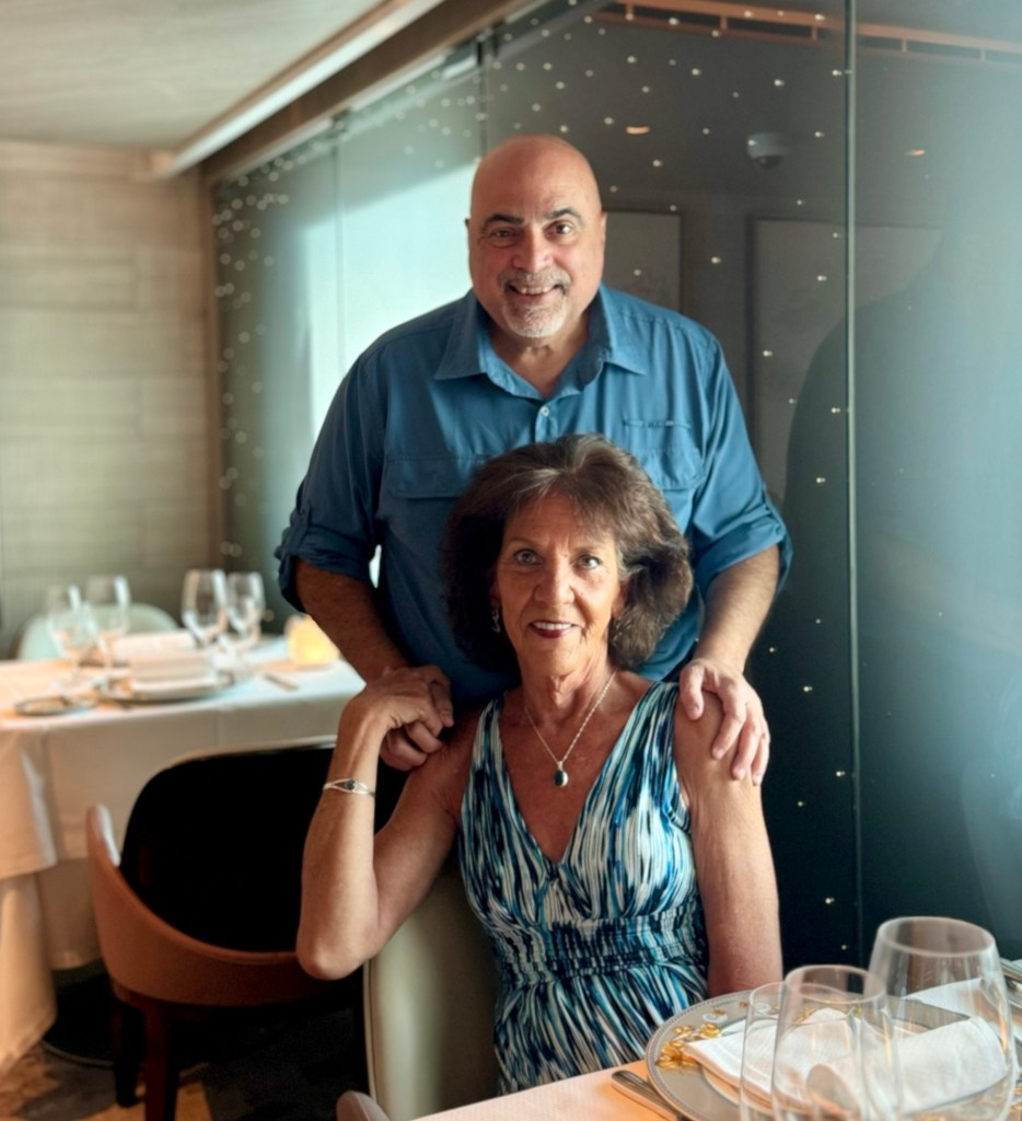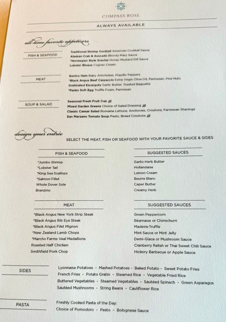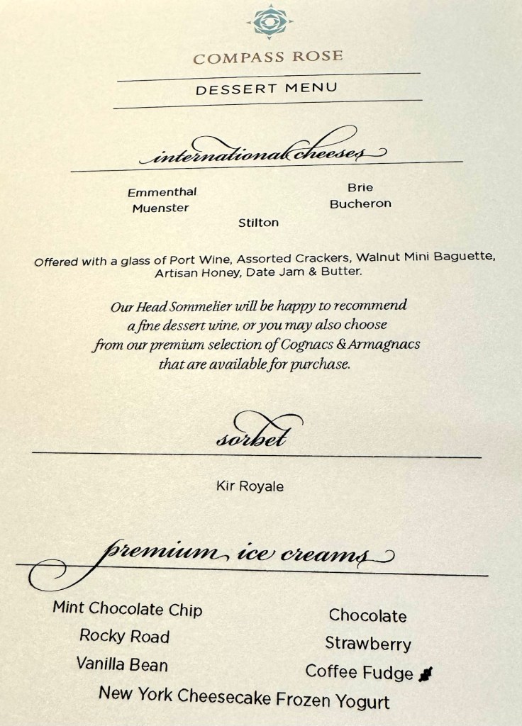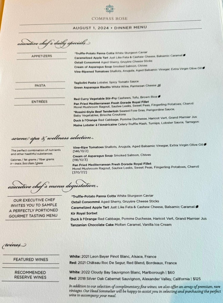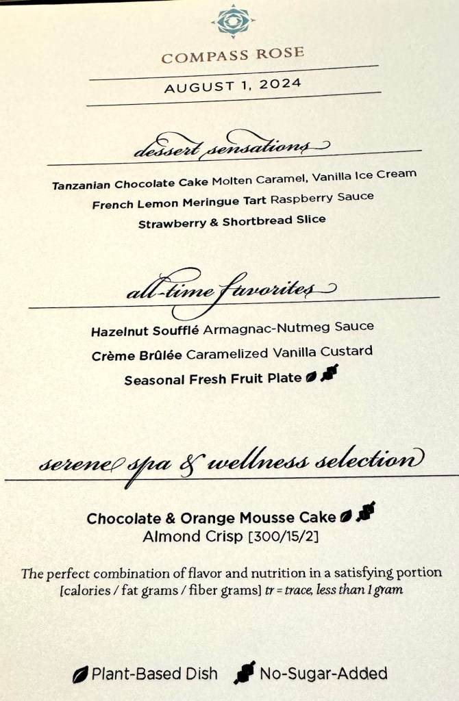 Hi Again All! We are easily getting used to this great Regent food. And we sorta took the “if it ain’t broke don’t fix it” approach tonight. Kathy got the same starters as last night which was Escargot and the Beef Carpaccio. I also got the Escargot again but then switched it up and tried the Cream of Asparagus Soup with Smoked Salmon… delicious! For her mains, Kathy got the Maine Lobster which she said was delicious and I got two Lobster Tails and the Ribeye. Both to die for! We both got the Tanzanian Chocolate Cake for dessert… so yummy!