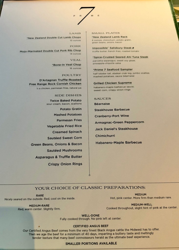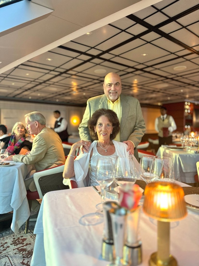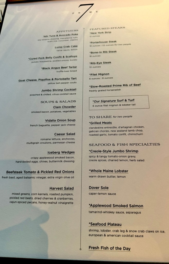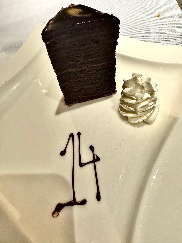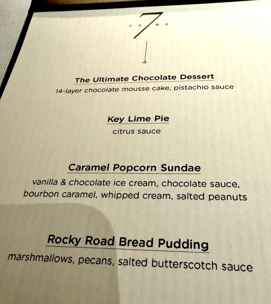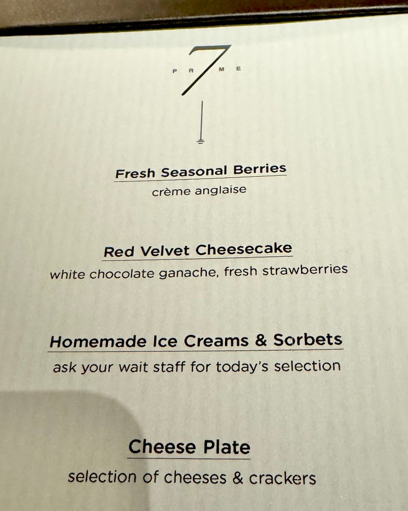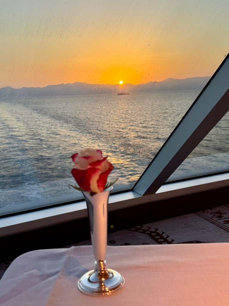 Hi Again Gang! We ended this incredible day with an incredible dinner. We went to our first specialty restaurant on this ship (there are 3) called Prime 7. It’s a traditional steak house and all the steaks are Black Angus and are aged for 40 days to give them an incredible flavor (notice how much I’ve said incredible!). And they gave us a sweet window table at the rear of the ship so we got a great sunset pic sailing away from Taormina!