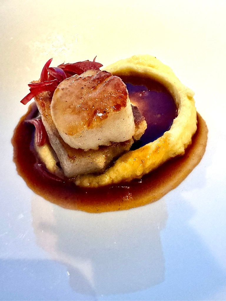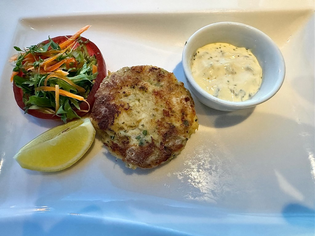 For dinner, Kathy got the Jumbo Shrimp Cocktail and Vidalia Onion Soup for her starters. I got the Crab Cake along with the Pork Belly with Scallop. Oh I forgot, they always start with an appetizer called an Amuse-Bouche, which is a French term that literally means “Mouth Amuser”. It was a Smoked Tomato soup and was very yummy.