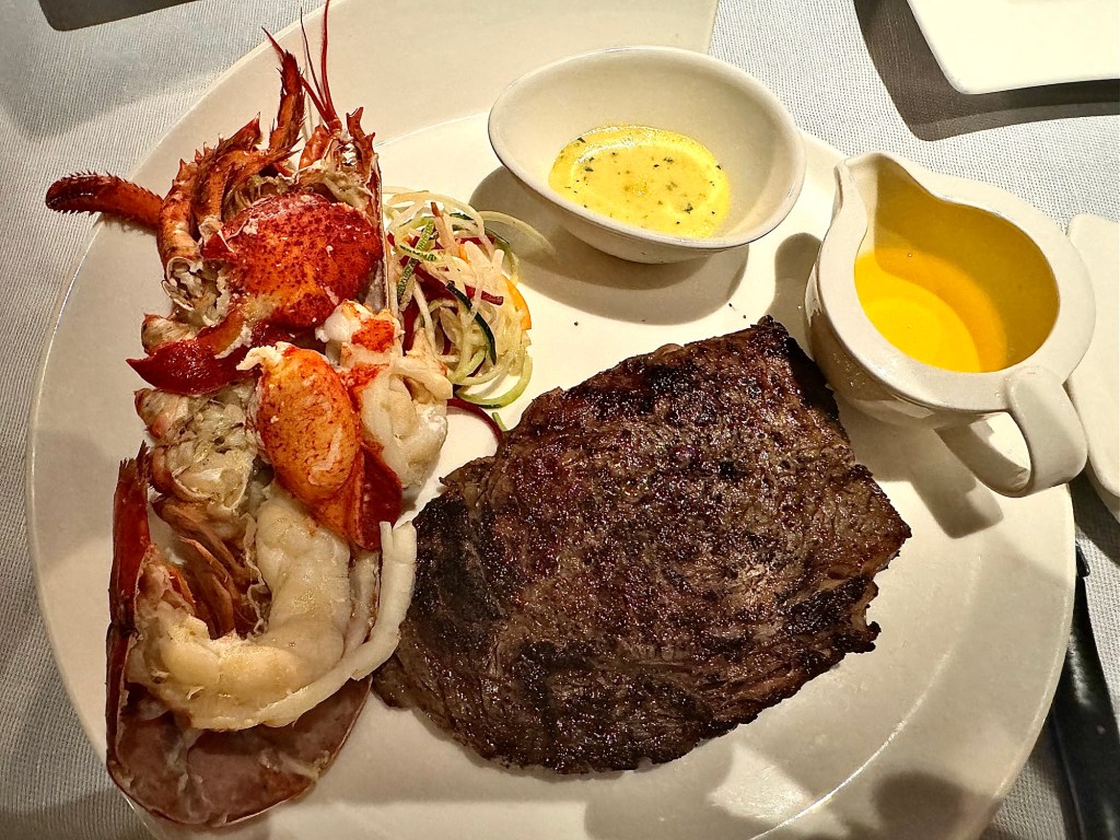 For our mains we both got similar to last night and each other but slightly different. Kathy got the surf and turf which was Filet Mignon and a Lobster Tail. I did my own version of surf and turf by getting the Whole Maine Lobster and the Ribeye Steak. My lobster and steak were even better than last night which is hard to do!