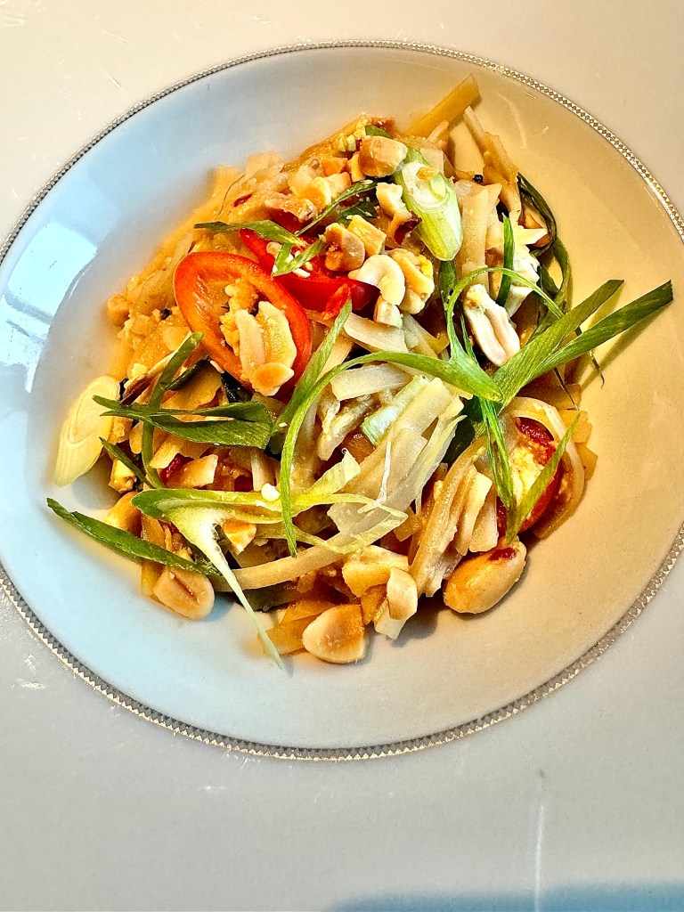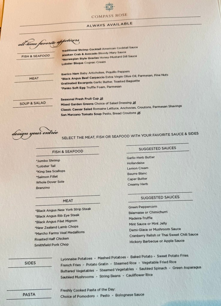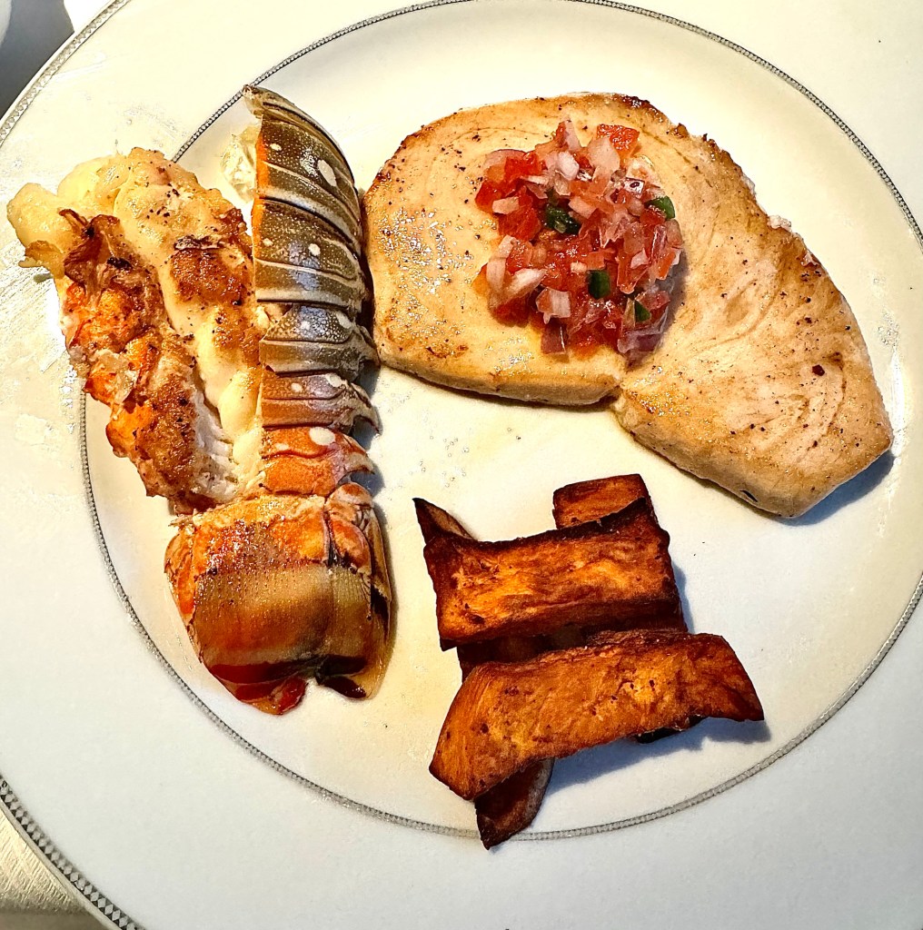 We went back to Compass Rose tonight (mostly since I needed to get back on the Lobster horse!). For our starters Kathy had the Escargot and a small portion of the Pad Thai while I had the Crepes (with smoked ham and goat cheese – so yummy!) along with a small portion of the Pad Thai. For our mains, Kathy got the Chateaubriand and I had the Swordfish with a Lobster Tail (of course!). For dessert we both had the Chocolate Mousse Tart. All of it was WOW!