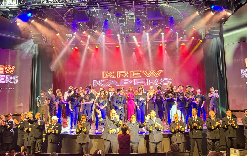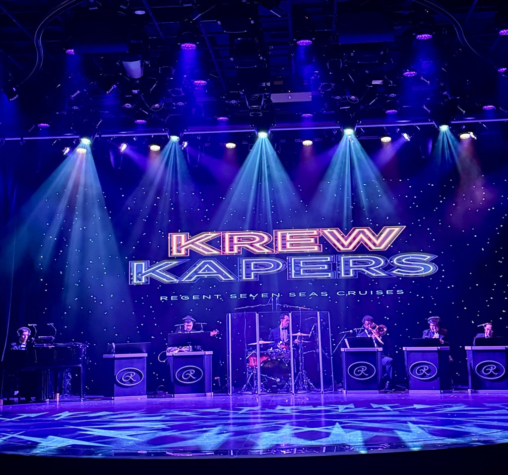 Hi Again Gang! We had a really fun night and started earlier than we normally do. At 6 PM they had a show that they call “Krew Kapers”. We’ve gone to it on other Regent ships and it’s where they let the crew perform on stage doing singing, dancing or playing instruments. Some of them were amazing! They work so hard taking care of everyone on the ship so it’s nice that they’re given a chance to shine. At the end of the show the Captain and his officers came to say goodbye to everyone.