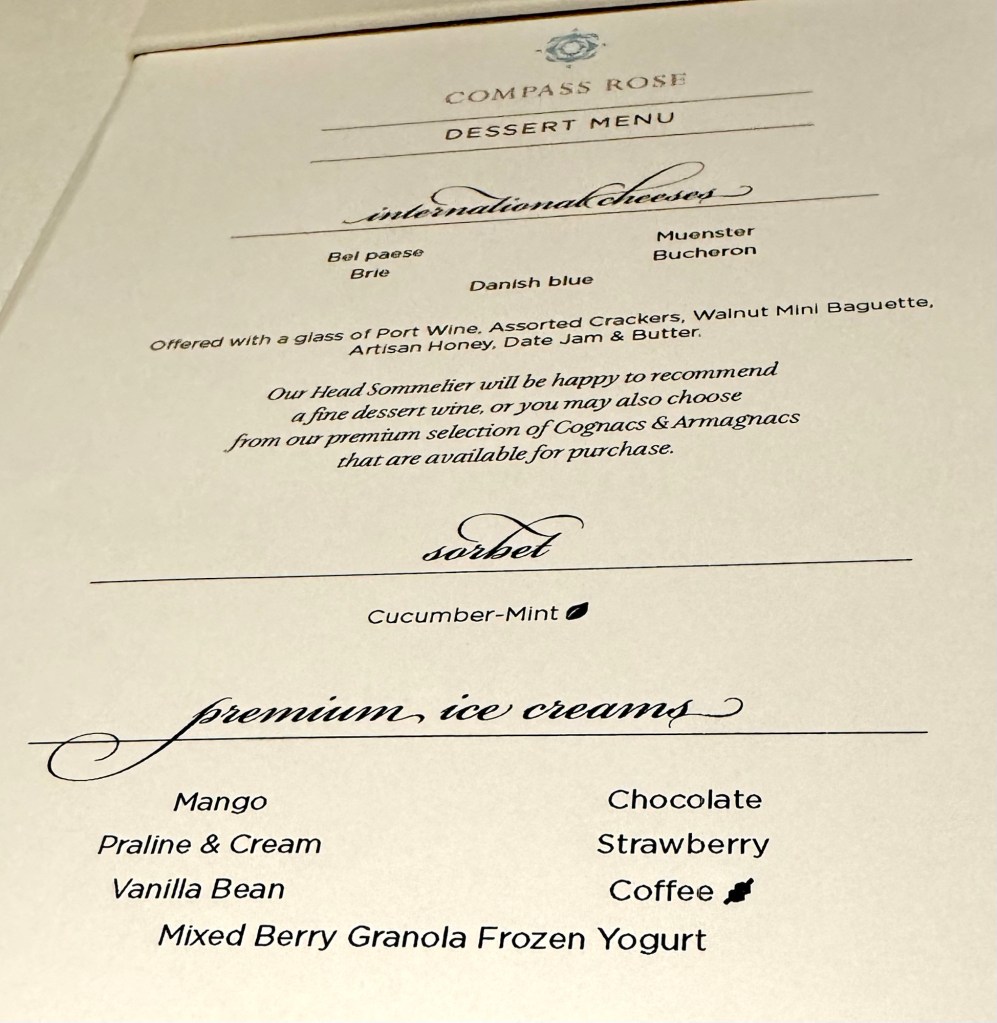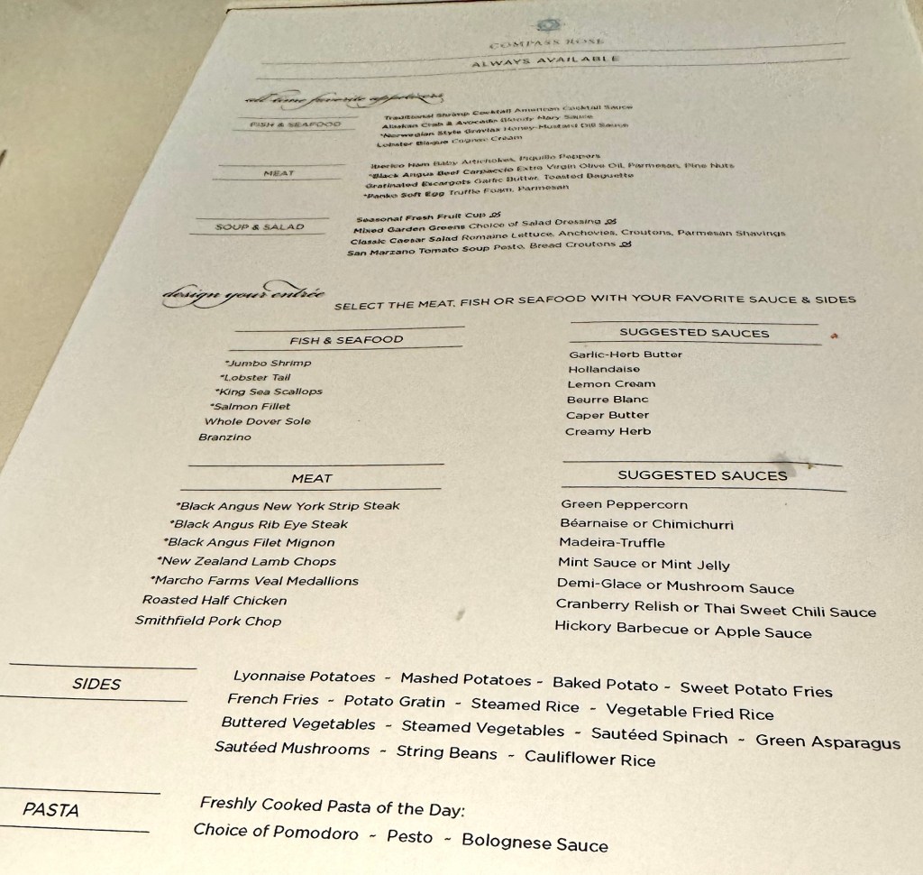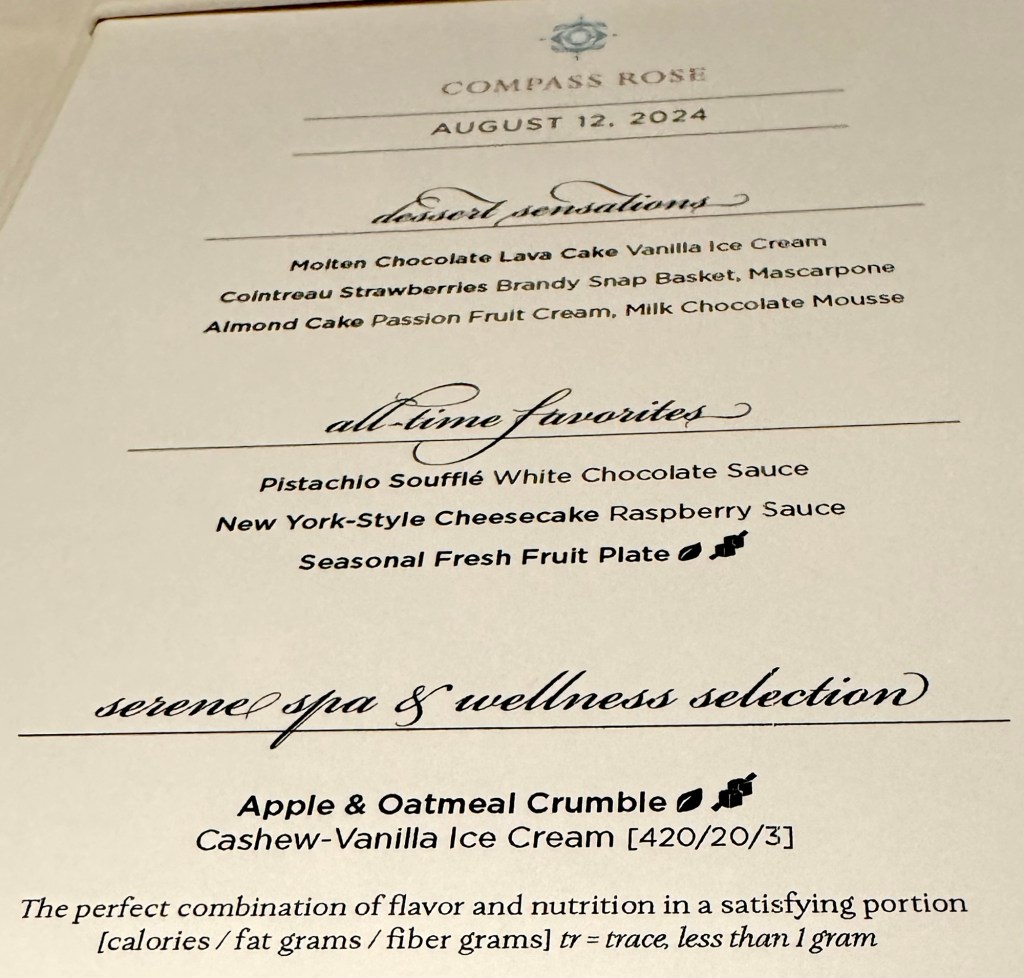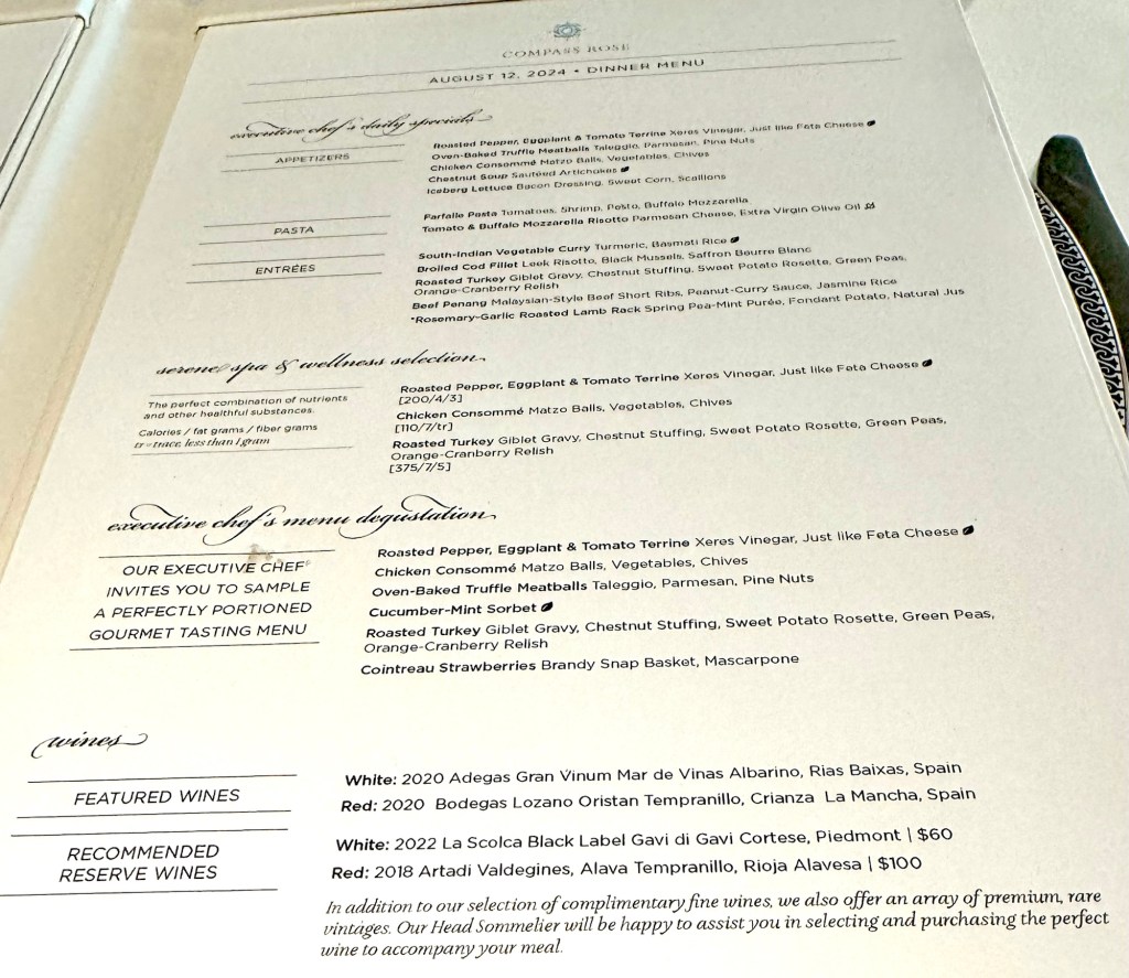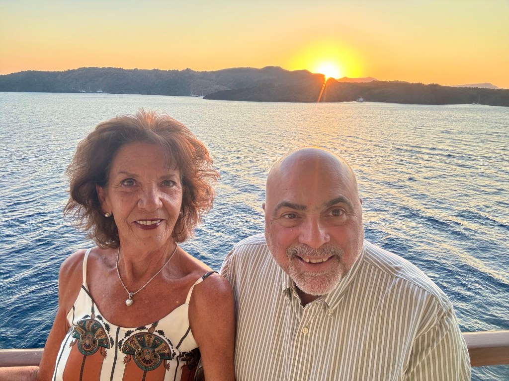 Will Miss Sunsets from this Balcony!Selfie Sunset in Santorini!Us at Dinner at Compass Rose!Dinner Menu – Page 1!Dinner Menu – Page 2!Beef Carpaccio!Escargot!Cod, Black Mussels and Risotto!Two Lobster Tails!Dessert Menu – Page 1!Dessert Menu – Page 2!
