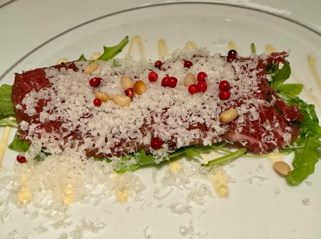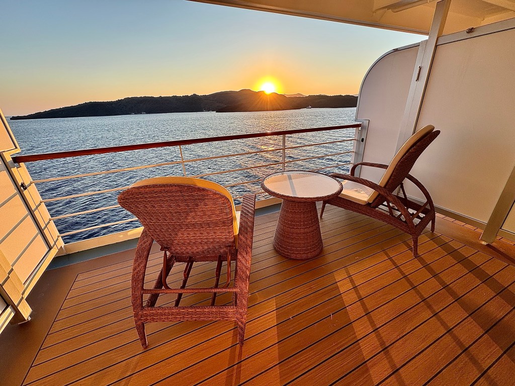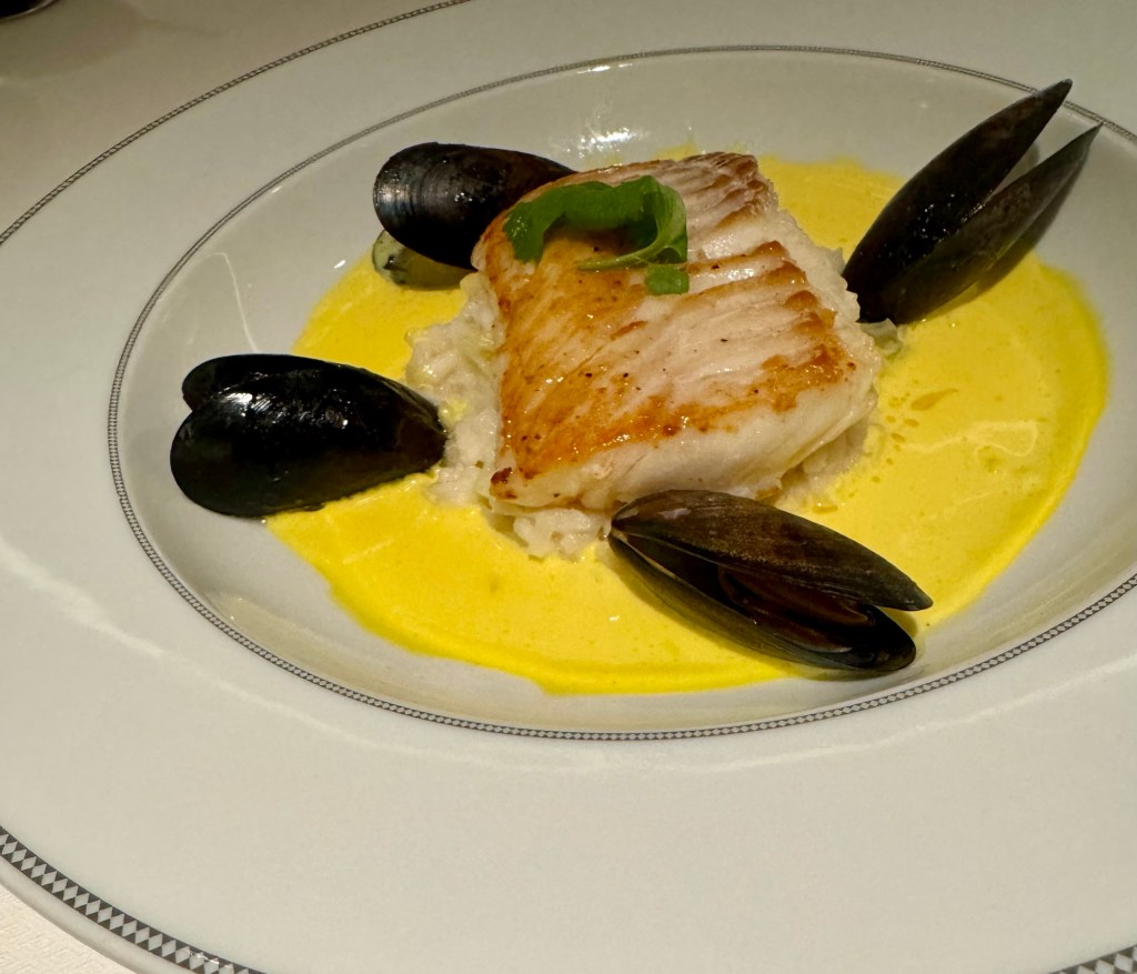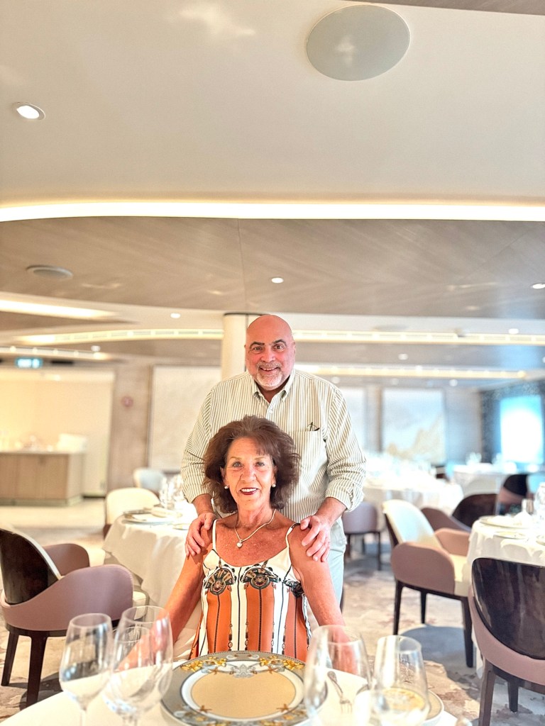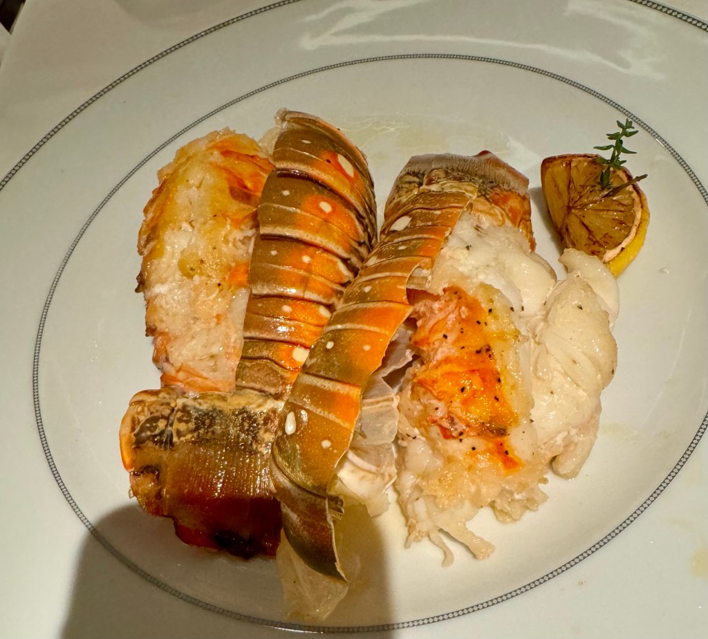 Will Miss Sunsets from this Balcony!Selfie Sunset in Santorini!Us at Dinner at Compass Rose!Dinner Menu – Page 1!Dinner Menu – Page 2!Beef Carpaccio!Escargot!Cod, Black Mussels and Risotto!Two Lobster Tails!Dessert Menu – Page 1!Dessert Menu – Page 2!