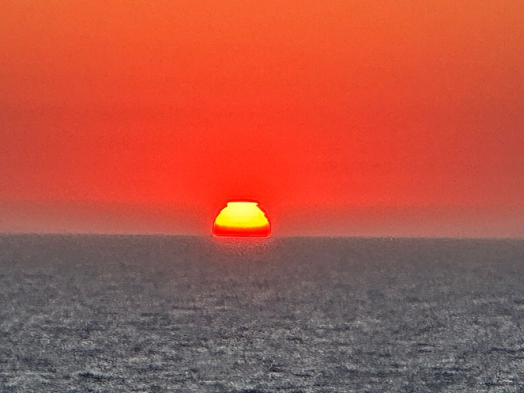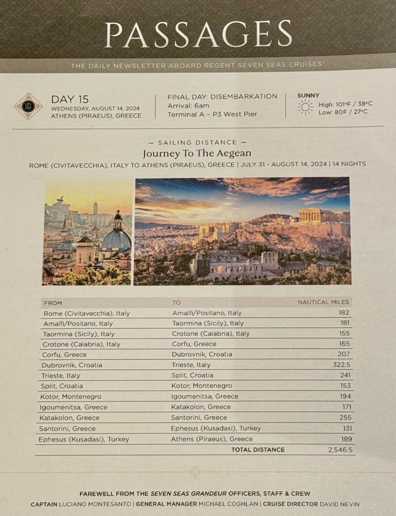 Since we’ll be traveling all day Wednesday, I’ll do a final trip update on Thursday. I added two bonus pics on this one. We caught a cool sunset tonight and included the trip summary page they sent us with the itinerary and total miles traveled, which was more than 2,500 nautical miles! Happy Hump Day tomorrow to all!