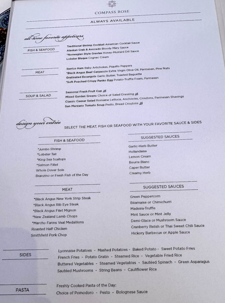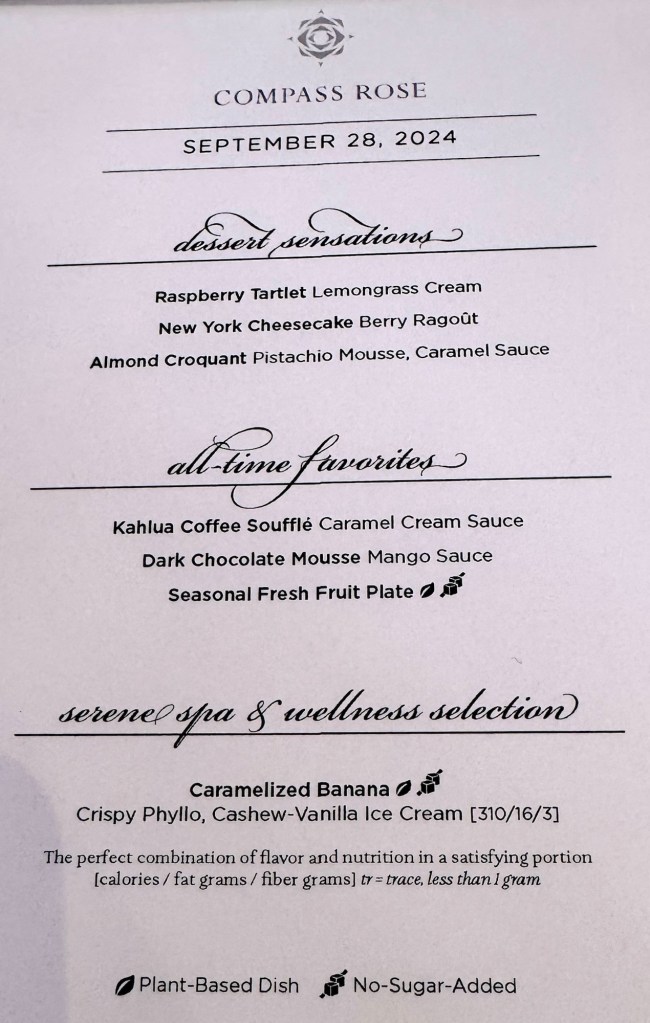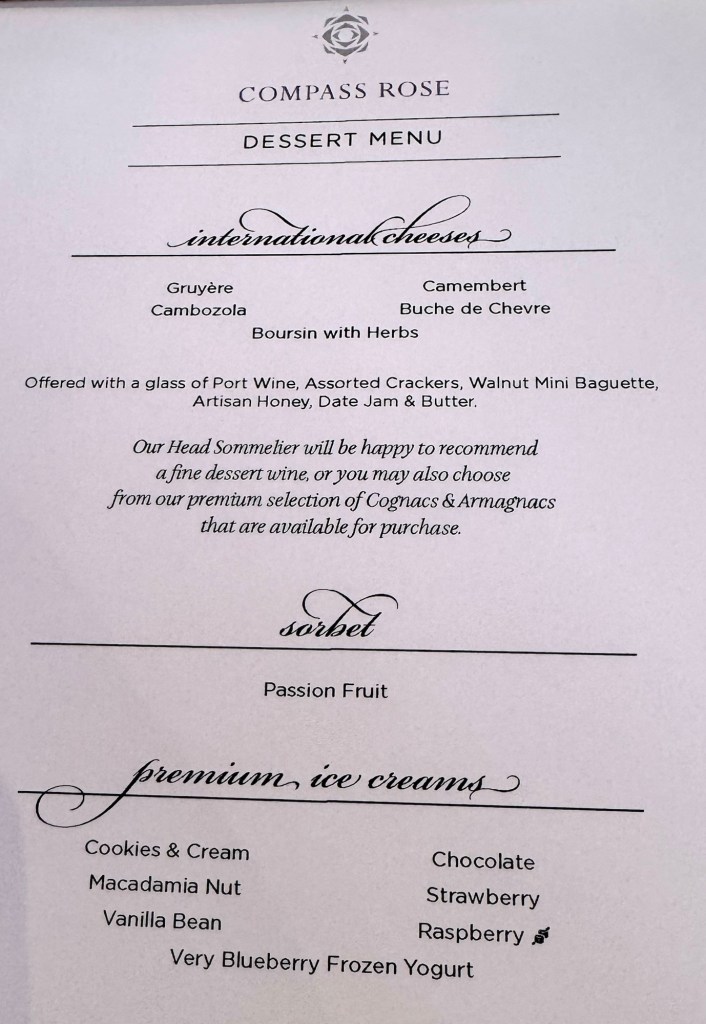 Dinner was once again of the highest Regent quality and my little lobsters were as succulent as ever! And the rib eye wasn’t too shabby. Desserts were decadent and the service was top notch. We loved the table they sat us at and hope to sit there again in the future. All in all a great dining experience!