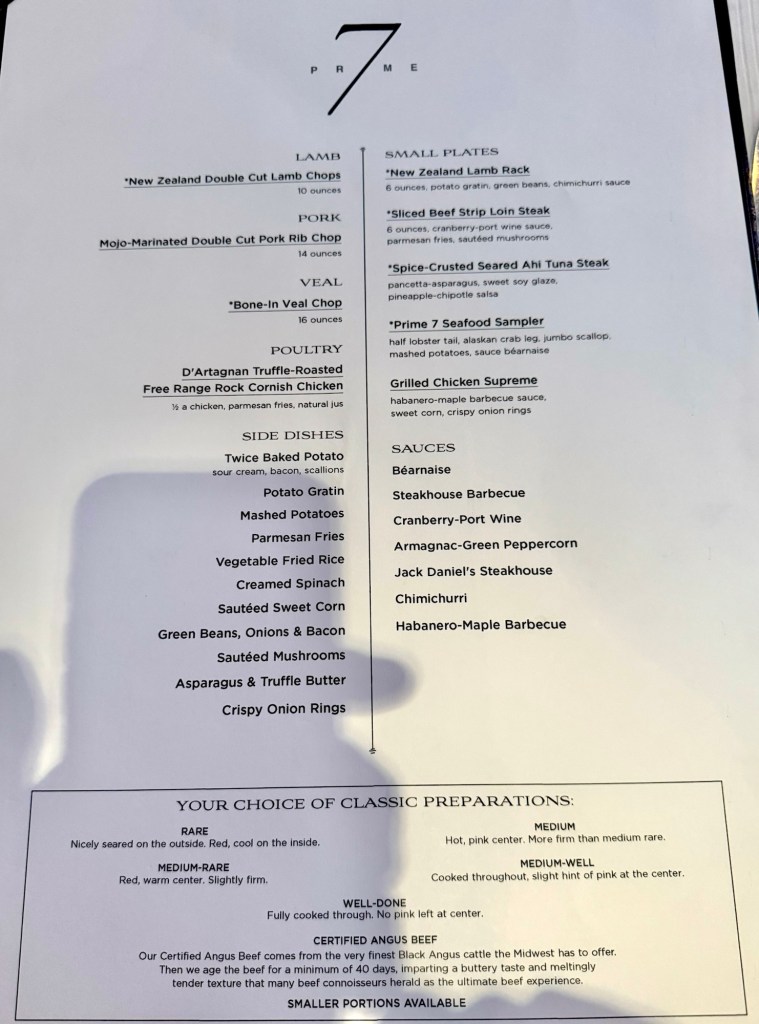 Hi again Gang! We had another great night. That Prime 7 specialty restaurant is one of the best restaurants on land or sea! We gave our tummy’s a run for their money with all the food we ate. Just look at those pictures. Bring on the Tums!