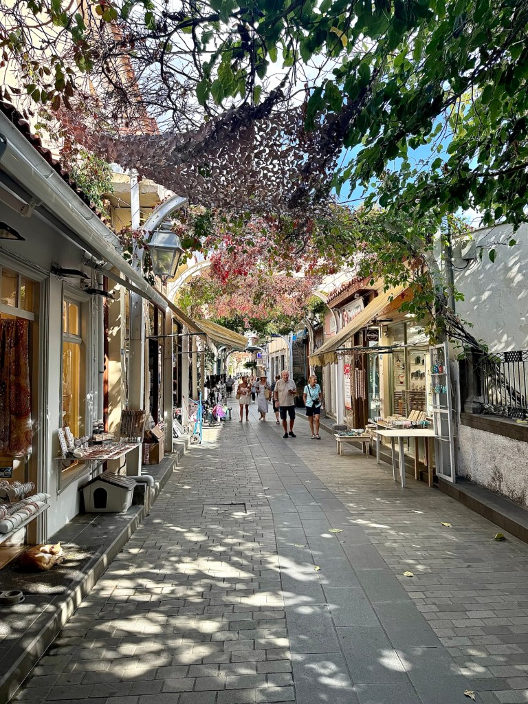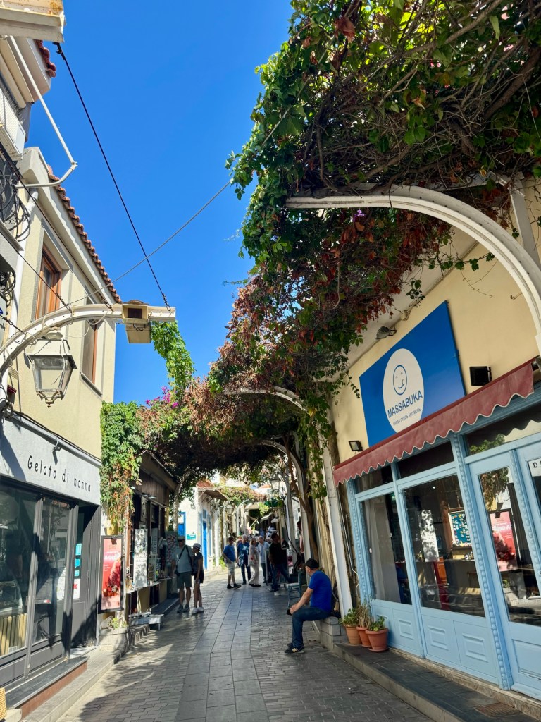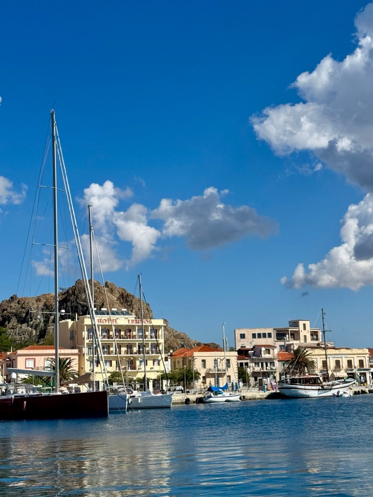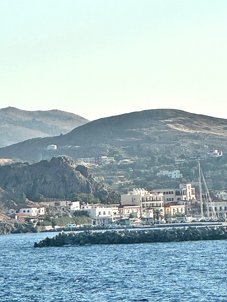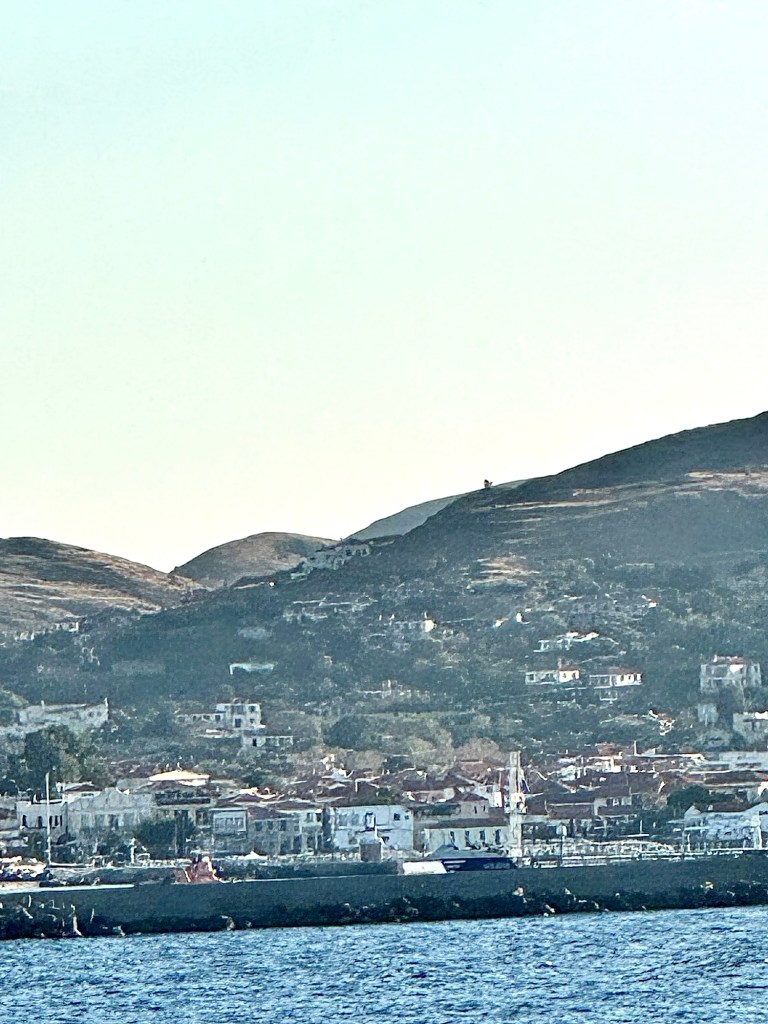 Today we are anchored off the coast of the Greek island of Limnos. They only had a few tours since the island is so small and none of them appealed to us. So we slept in and took the tender boat over in late morning and explored the little village on foot. It is a cute little place with lots of alleyways with ivy growing over the middle to keep it shaded. And the weather was once again picture perfect with it being sunny with highs only in the low 70’s. Perfect for walking around!
