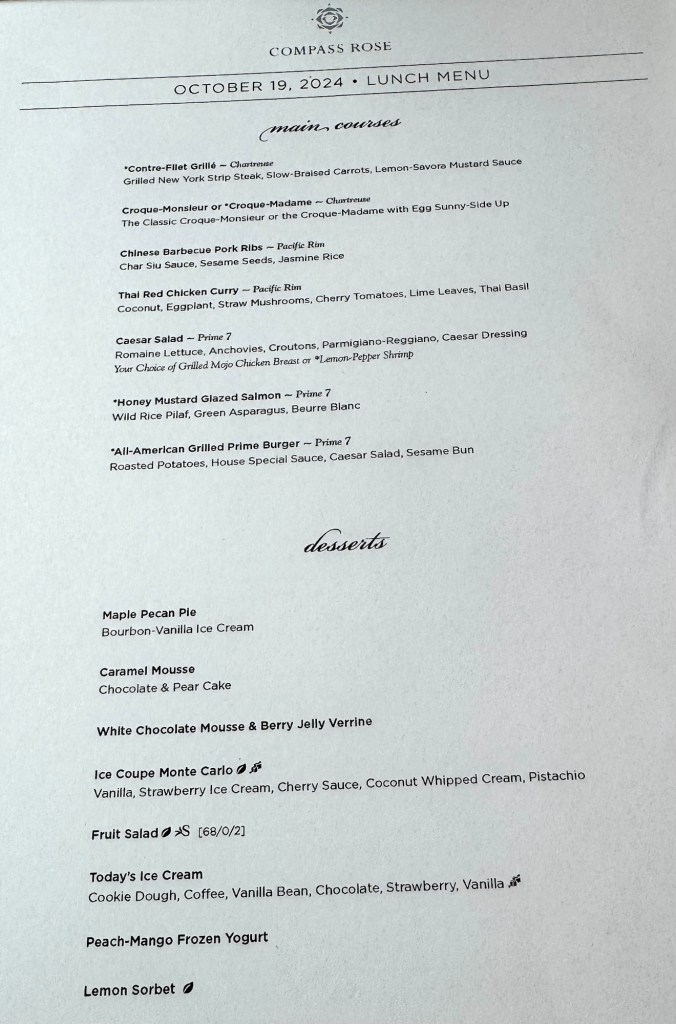 So we slept in and had a nice sit down lunch in Compass Rose. Had their yummy Chinese BBQ Pork Ribs! We then played their organized game of corn hole and Kathy came in 2nd! In the afternoon we watched the Godfather movie since we’re here in the heart of Italy. Such a classic movie! Then we played their organized game of putt putt golf and came close but didn’t win. But it was fun!