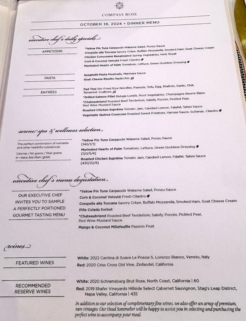 We then went to dinner in Compass Rose. I kept to my mostly seafood diet but once again gave the lobsters a break. Of course I had my escargot but also tried the Toscana crepe and had the Dover Sole for my main. The chocolate tart for dessert was to die for! Yummy!!
