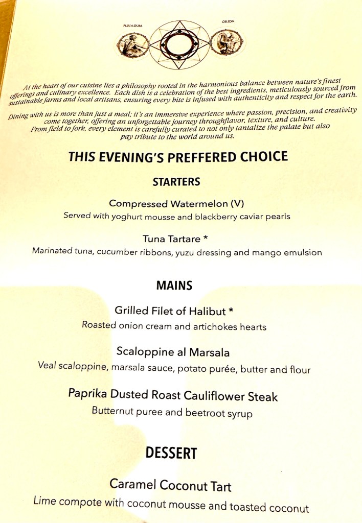 Hi Again Gang! We got back really late from our excursion and had to rush to make dinner. We ate at Atlantide again since we like it there. I did all seafood (but laid off the lobster since that pic I took with the lobster today freaked me out!). I had Tempura Prawns for my starter and Grilled Filet of Halibut for my main. Both were very good.