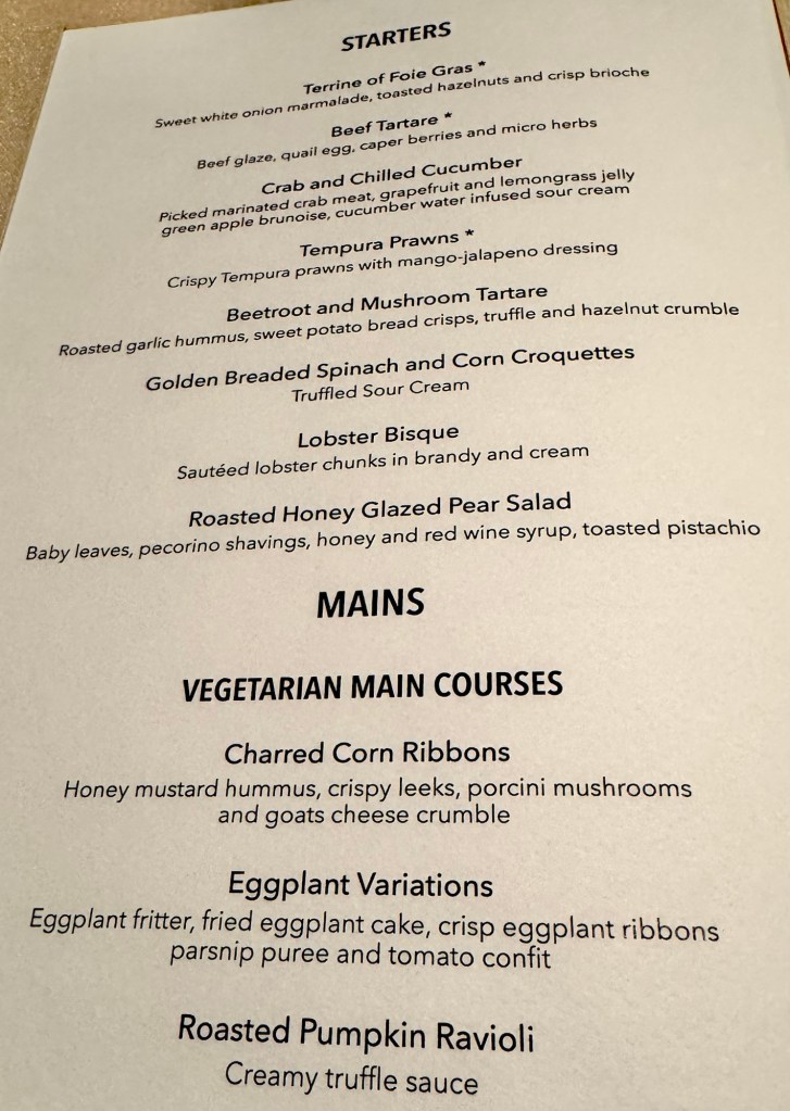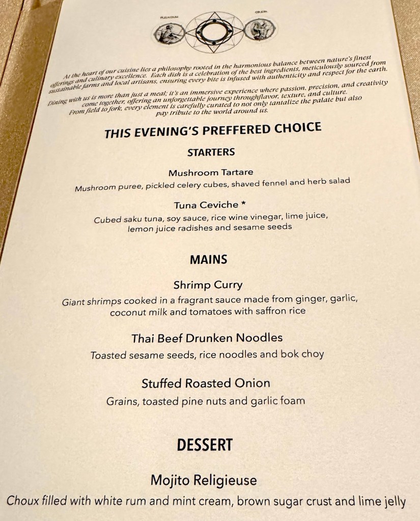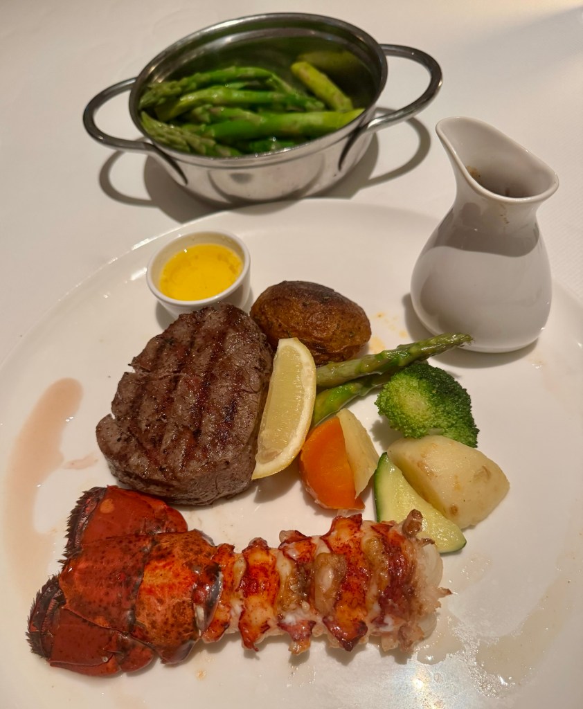 So I had both lobster bisque and lobster tail with filet mignon so the LPS (Lobster Protection Society) be damned! They again didn’t have any good chocolate desserts but we tried a caramel dessert at the suggestion of our waiter and while it was OK, it wasn’t chocolate!