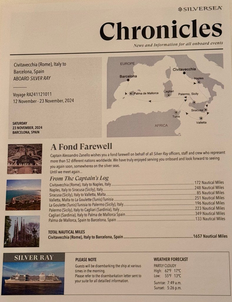 We really enjoyed this ship so they may need to kick us off! We did hear that there were 680 passengers onboard with us and only 20 lucky folks are staying on for the next leg to Lisbon. Wish it was us! On this trip we traveled 1,657 Nautical Miles. Just a drive around the block for us. Lol.