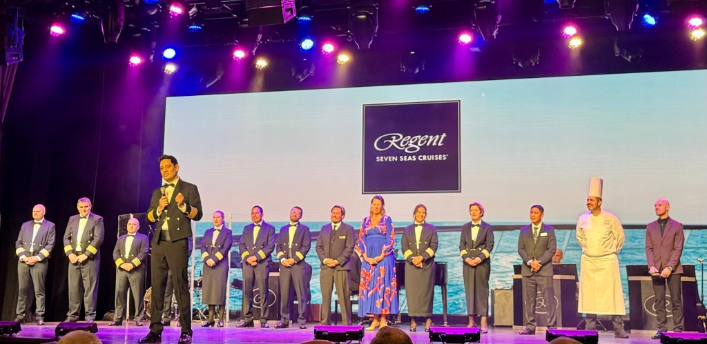 After getting all gussied up for formal night, we went to the Captain’s Welcome party. He thanked everyone for being on the voyage and introduced all his senior staff. They also mentioned that there are 275 people doing the full World Cruise and 300 of us “segmenters” just doing a segment or two of the full trip.