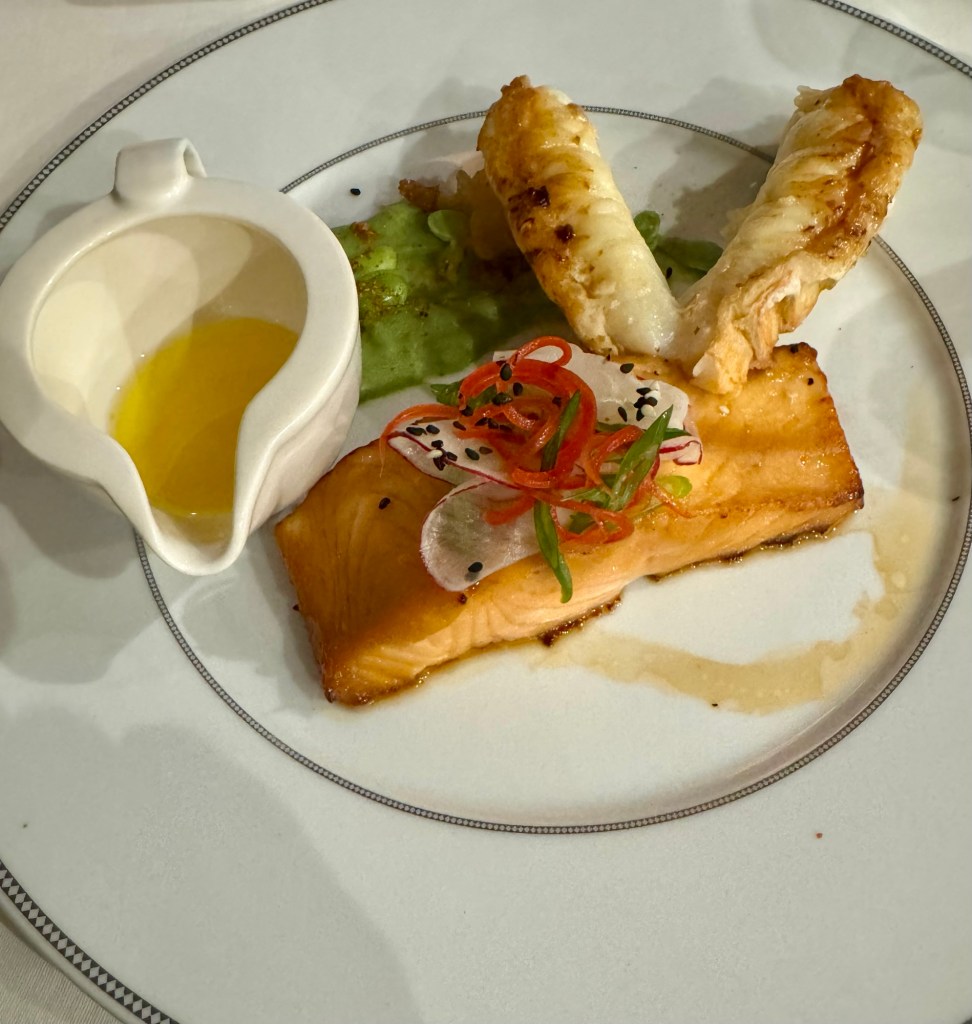 We then went to Compass Rose for dinner and had another great meal. I started off with caviar (well, LAH-TEE-DA!) and cream of asparagus soup for my starters and then Sake Glazed Salmon and a lobster tail for my main. We both had the Tanzanian Chocolate Cake for dessert. Yummy all around!
