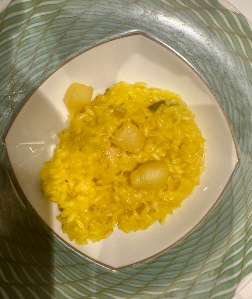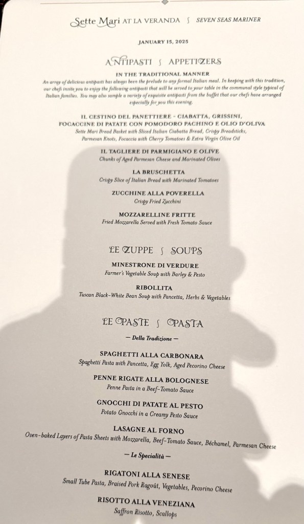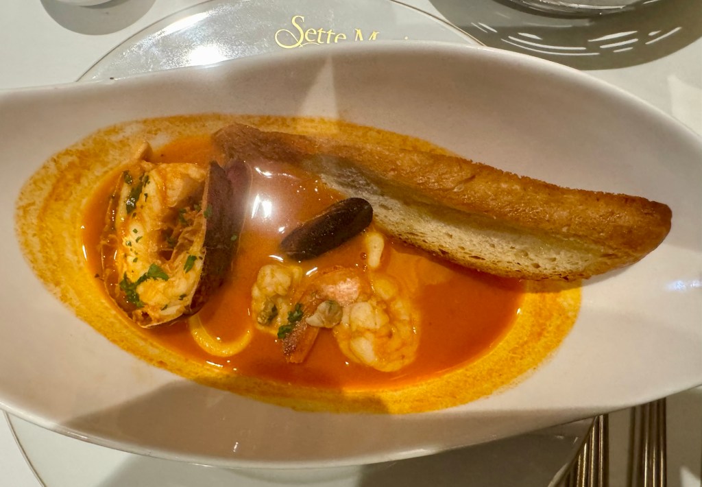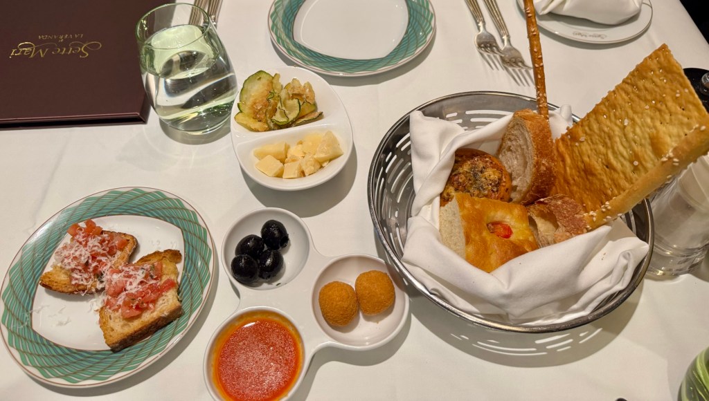 For dinner we tried a new restaurant called Sette Mari. It’s their Italian specialty restaurant that’s only available in the evening. They start you off with this huge antipasto selection with lots of yummy items. I then got seafood risotto, fish stew and a grilled fish platter with a cute baby squid on it! All the food was very good and we’ll probably try it again!