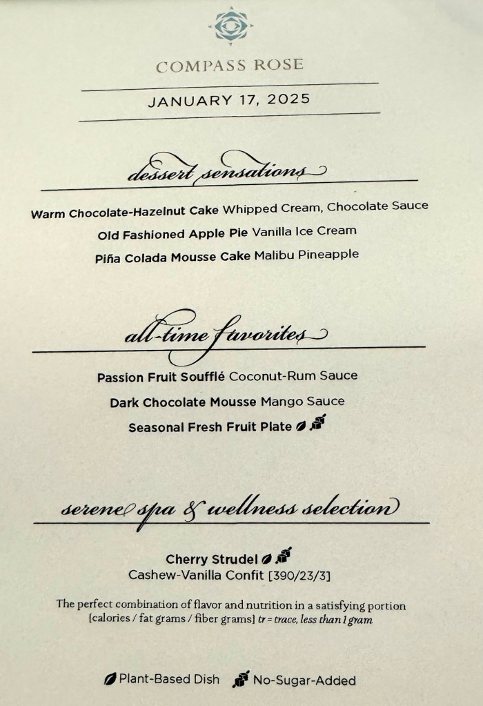 After that we got ready for guess what… dinner! Yes, more eating! We went to Compass Rose and had chicken noodle soup and shrimp risotto for appetizers and Mahi Mahi for the main. And the chocolate cake for dessert was pretty awesome too!