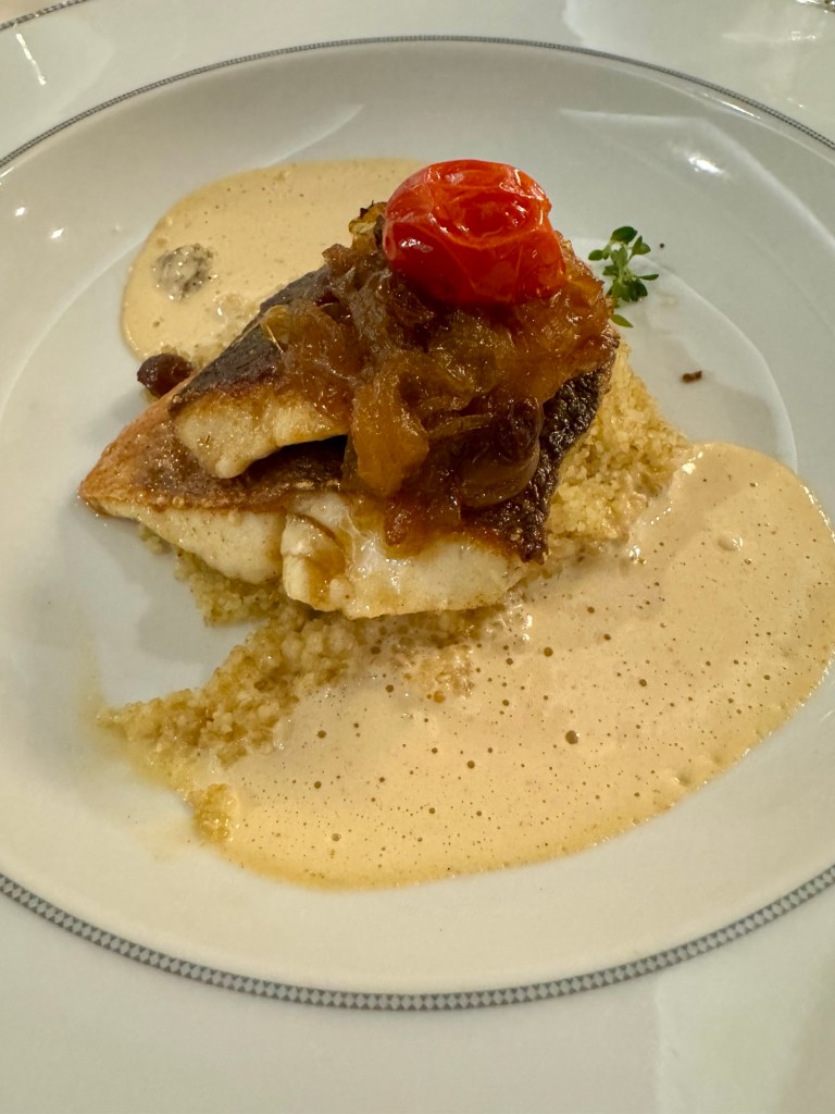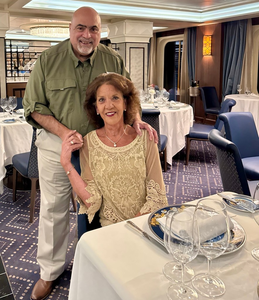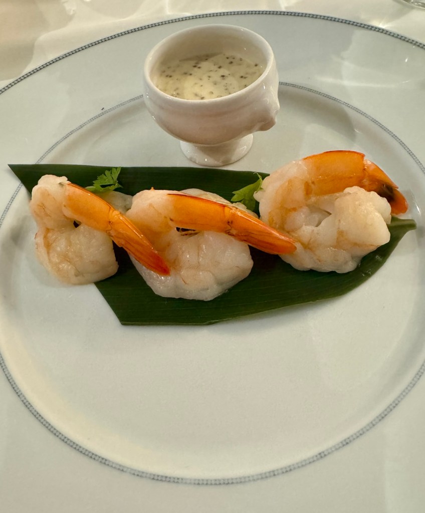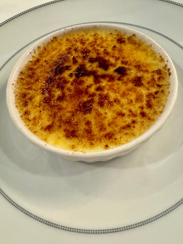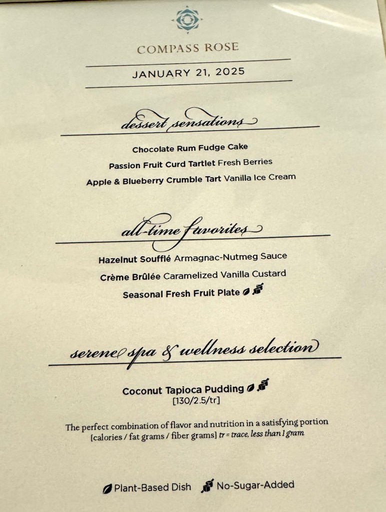 Hi Again All! We had another great evening of good food and good entertainment. We started off with dinner in Compass Rose, arguably the best Main Dining Room at sea. We went back to our favorite waiter Dennis’s table. He always takes good care of us. Had Tiger Prawns for a starter followed by Artichoke Soup and finished with Branzino. Topped it all off with Creme Brûlée. Now that’s a great meal!