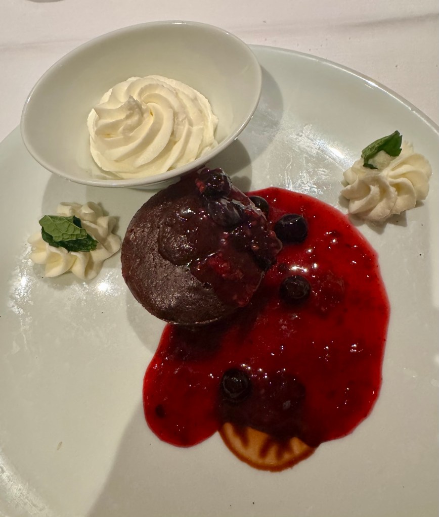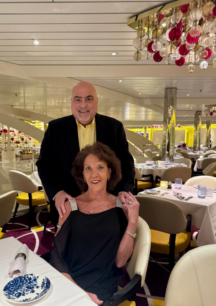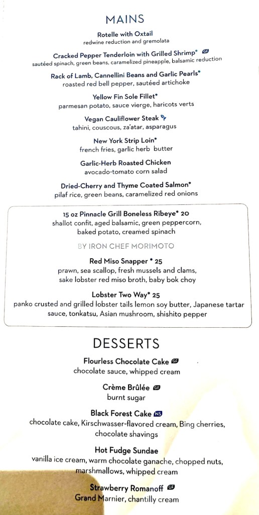 After that we got ready for dinner. Tonight was a dress up night so we put on our finest and strutted down to the main dining room for dinner. Kathy was wearing a classy outfit with some bling on it and all the ladies were commenting that they loved it. So why don’t I get any comments?? Lol. We asked for Gerald, our waiter from day one, but we weren’t able to sit at his table. Tonight’s waiter, Rouf, was nice but he was no Gerald!