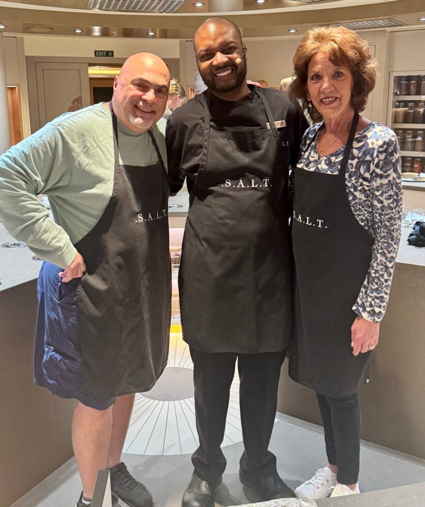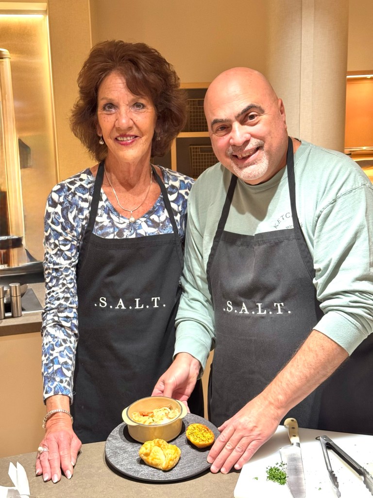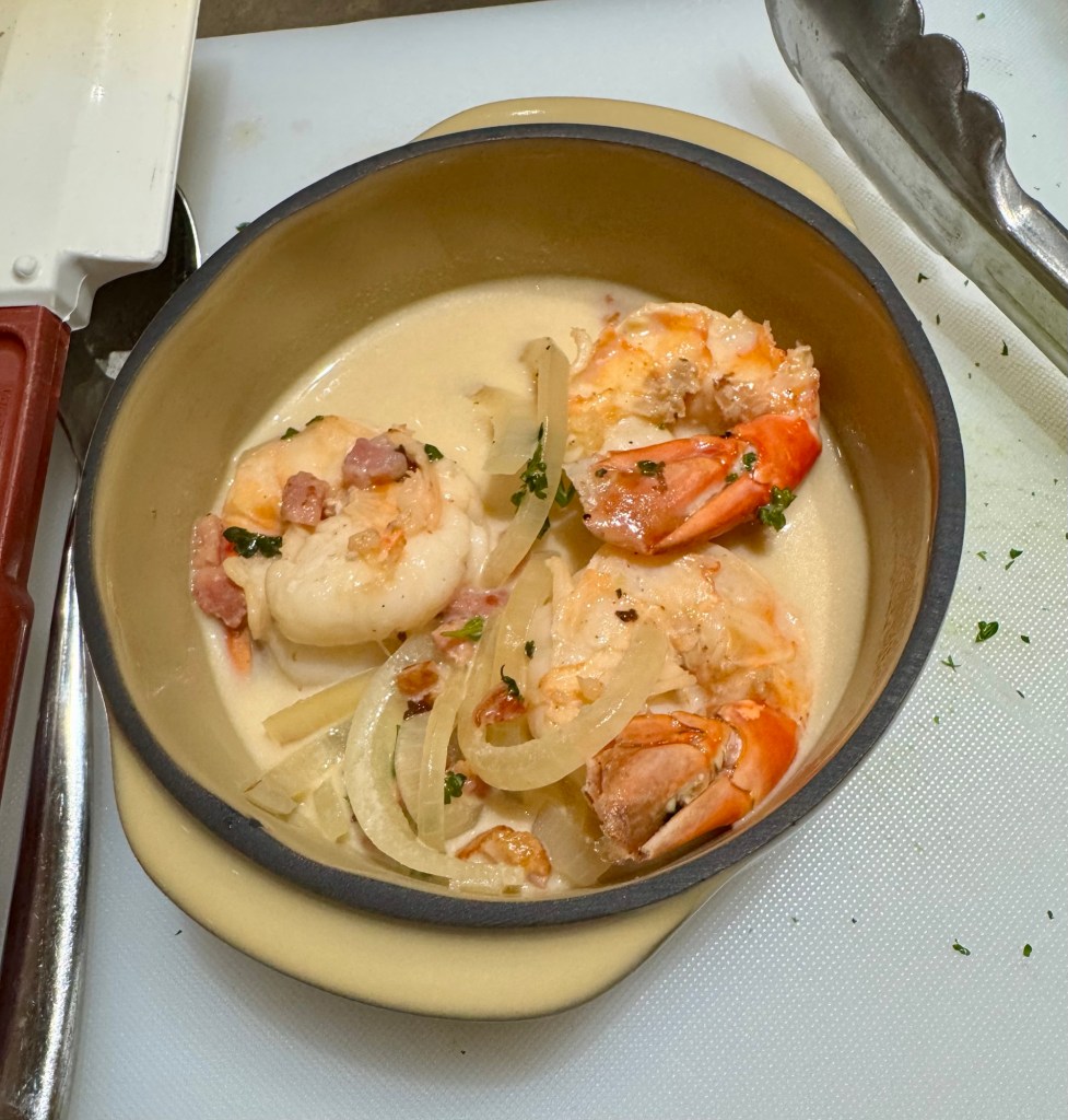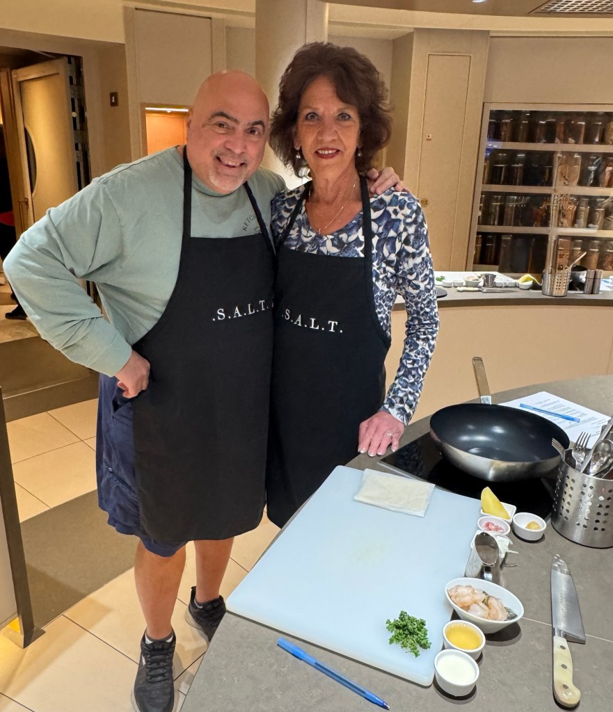 We then went to our cooking class in what they call the S.A.L.T. Lab (Sea and Land Taste). It’s great that they offer these classes for free and they focus on making food from the local region you’re in. We even had our same chef Derek from our Dec 2023 cruise. Such a great guy! Today’s class was called “Countryside to Coast: Normandy’s Culinary Riches”. We made Moules a la creme Normande which was shrimp cooked in a creamy sauce. We also made Bourdelot which was an apple cooked in a puff pastry. Both were delicious!!
