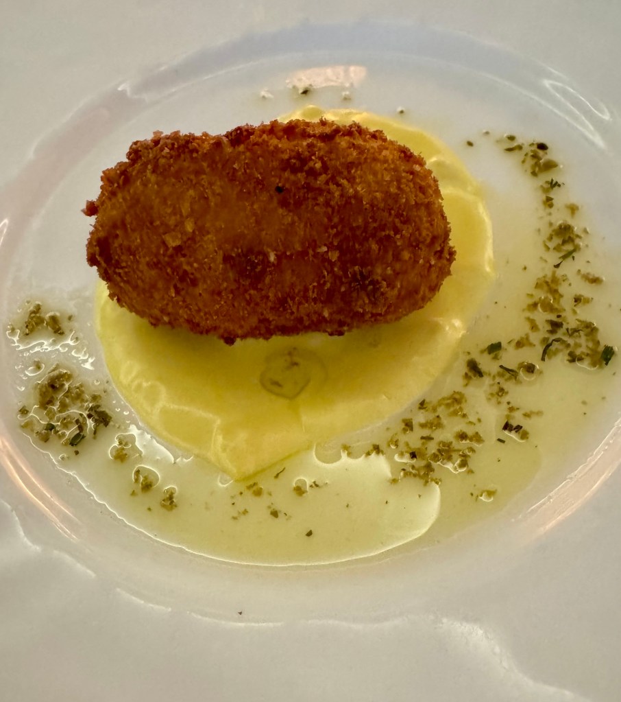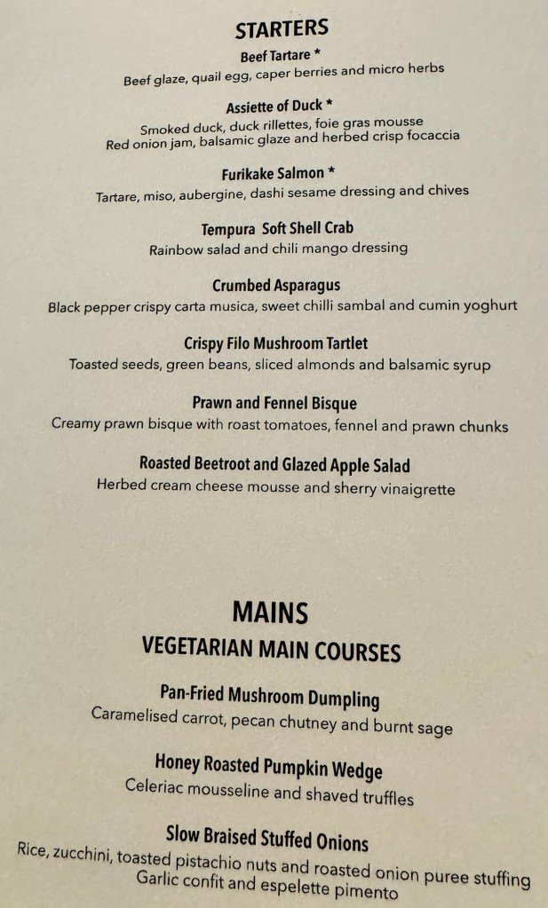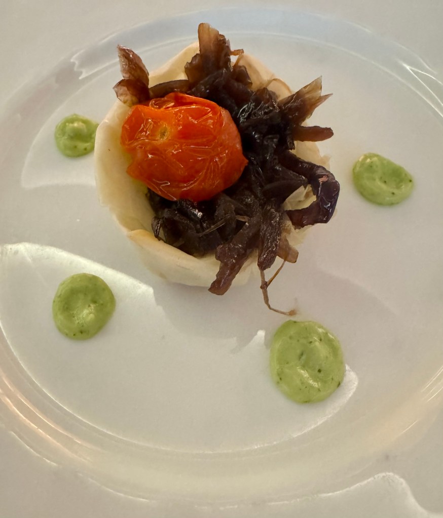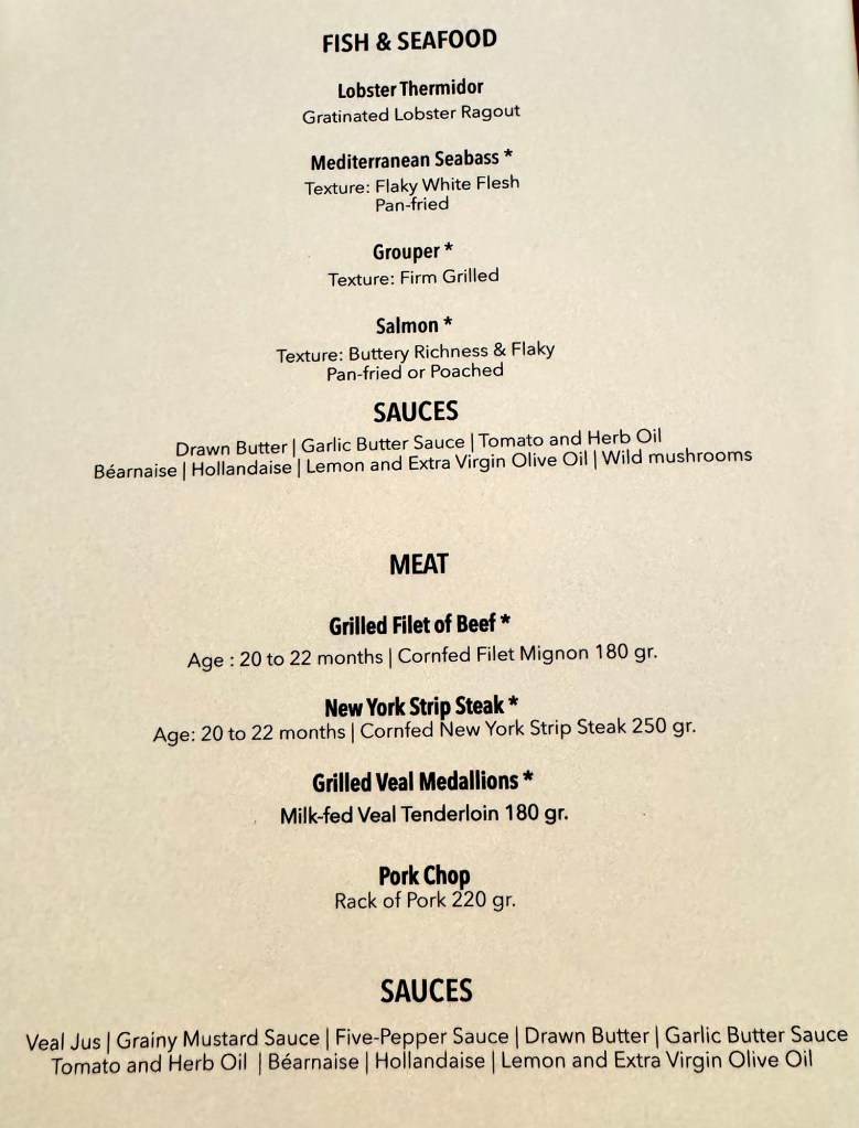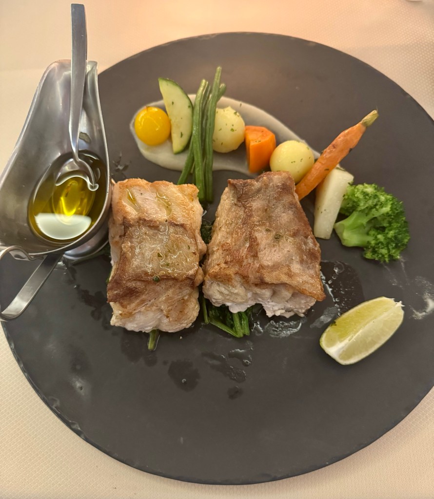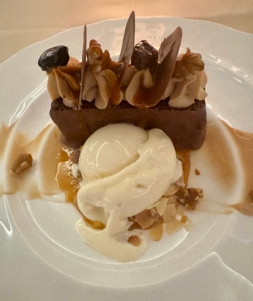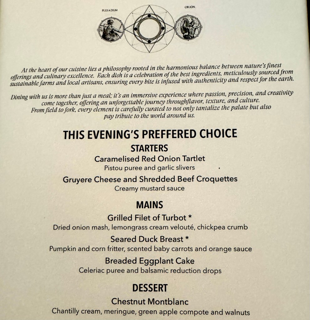 Hi Again Gang! We enjoyed our evening once again. Had dinner in Atlantide and ate way too much food (again!). I started with the Caramelized Red Onion Tartlet as my first appetizer and the Gruyère Cheese and Shredded Beef Croquette for my second. My main was this huge portion of Grouper that was really tasty. For dessert they had an interesting combination of Carrot Cake and Chocolate that actually wasn’t too bad.