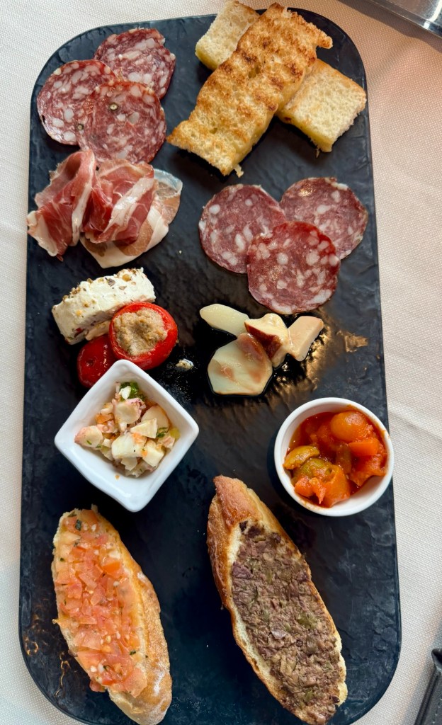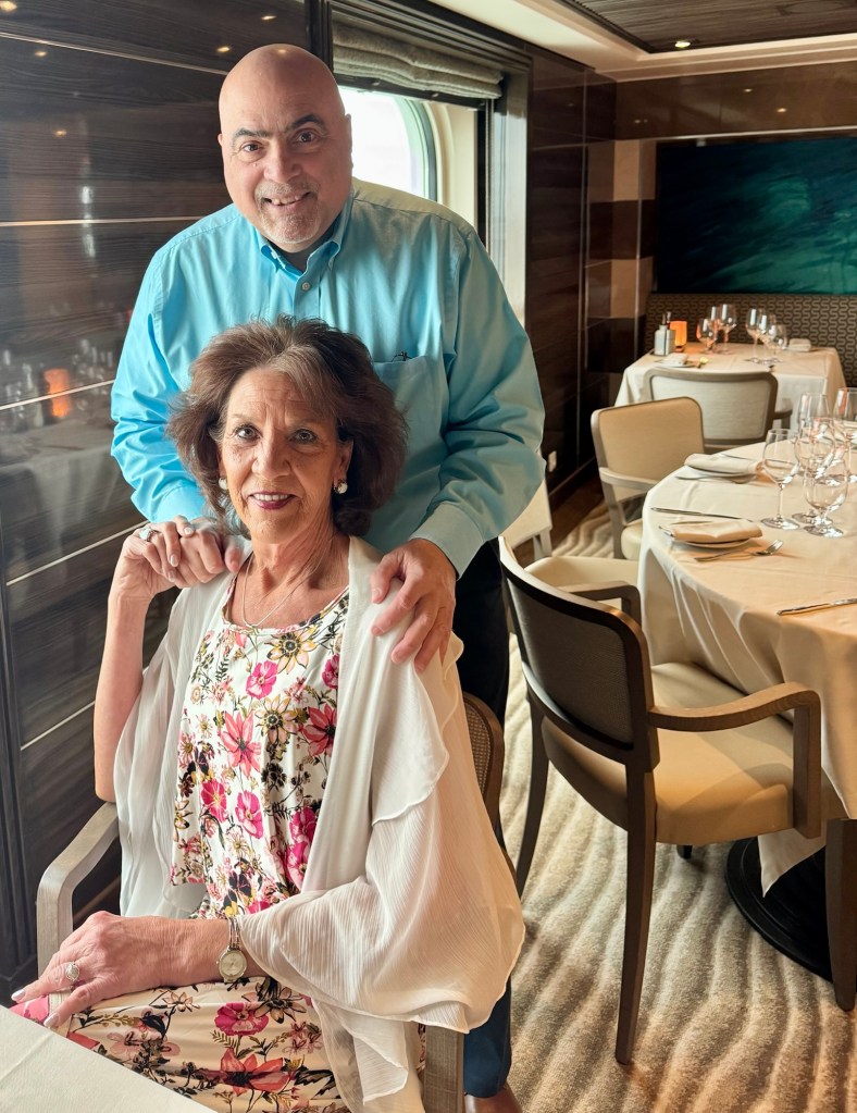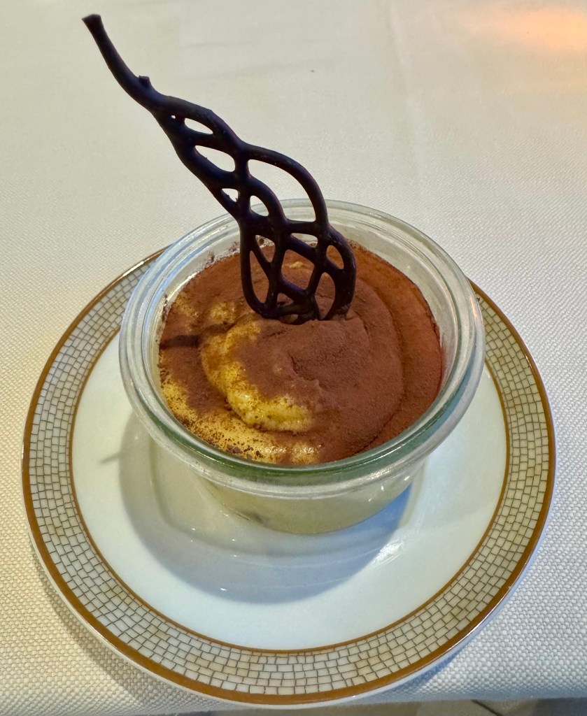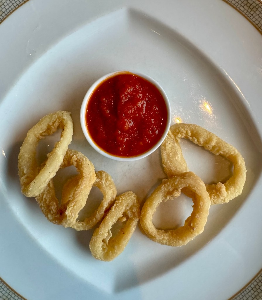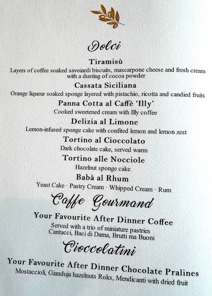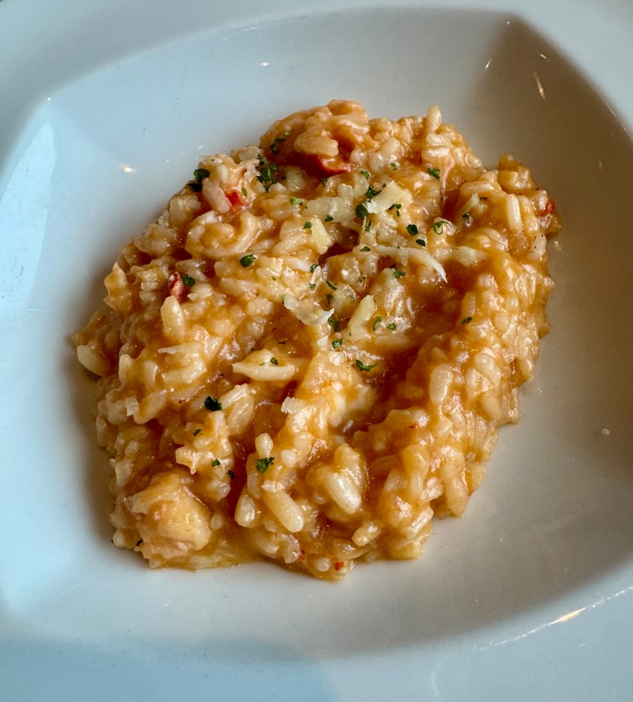 I had calamari and lobster risotto as my starters. For my main I had a delicious Veal Ossobuco that just melted in your mouth. For dessert I had the Tiramisu which was really good. We sat next to a couple that was on the entire World Cruise and picked their brains for tips. It made us even more fired up for next year’s adventure!!