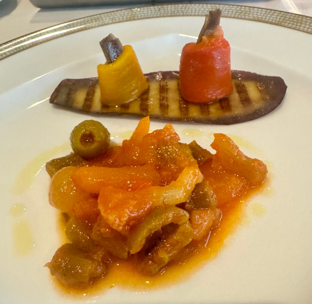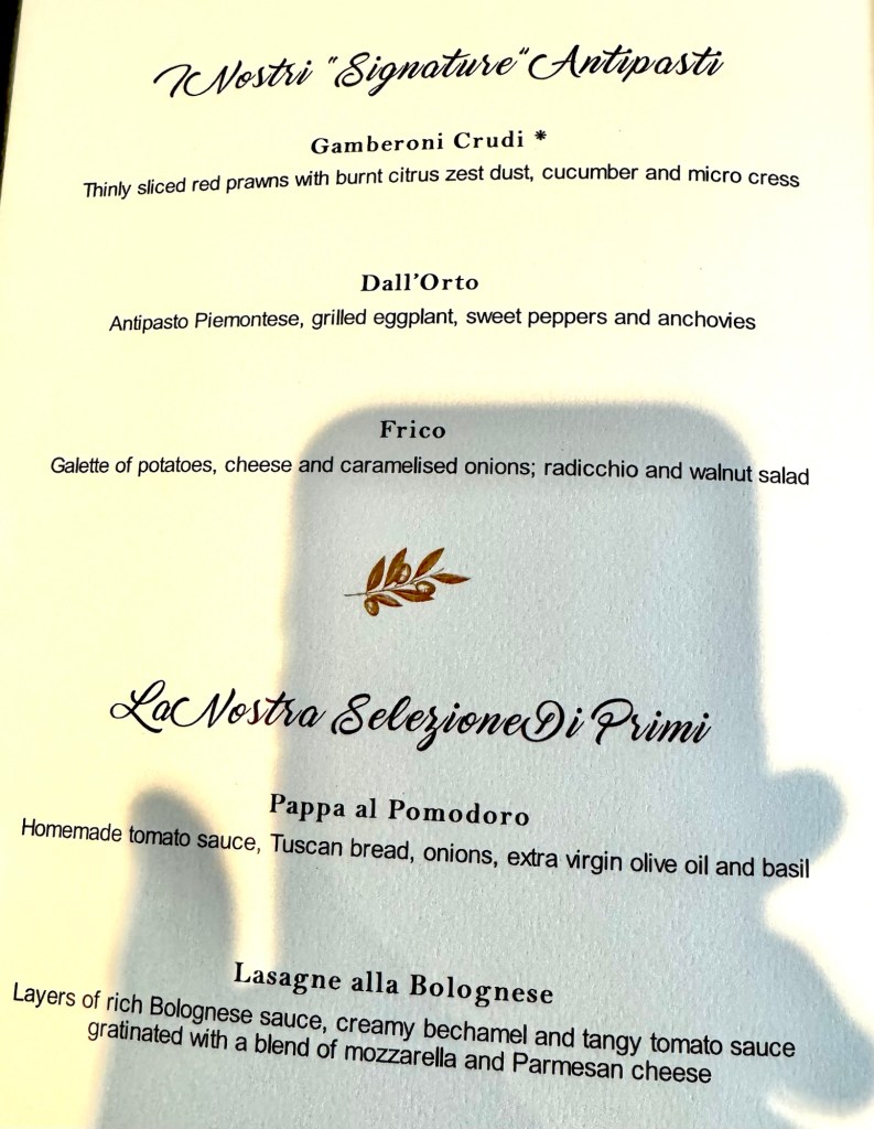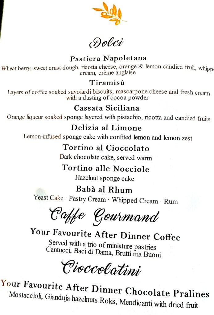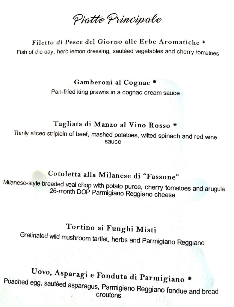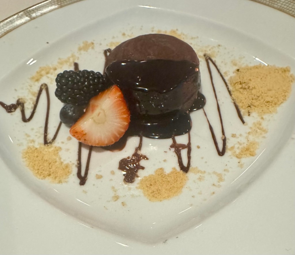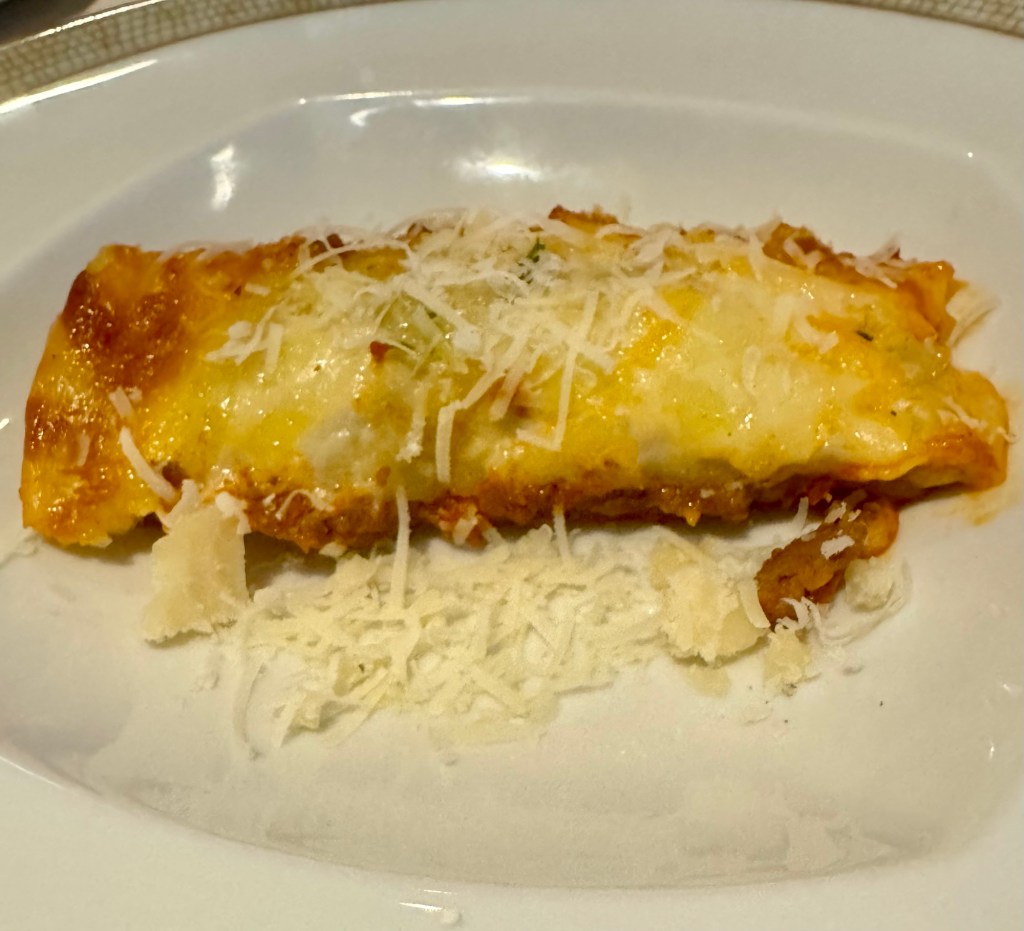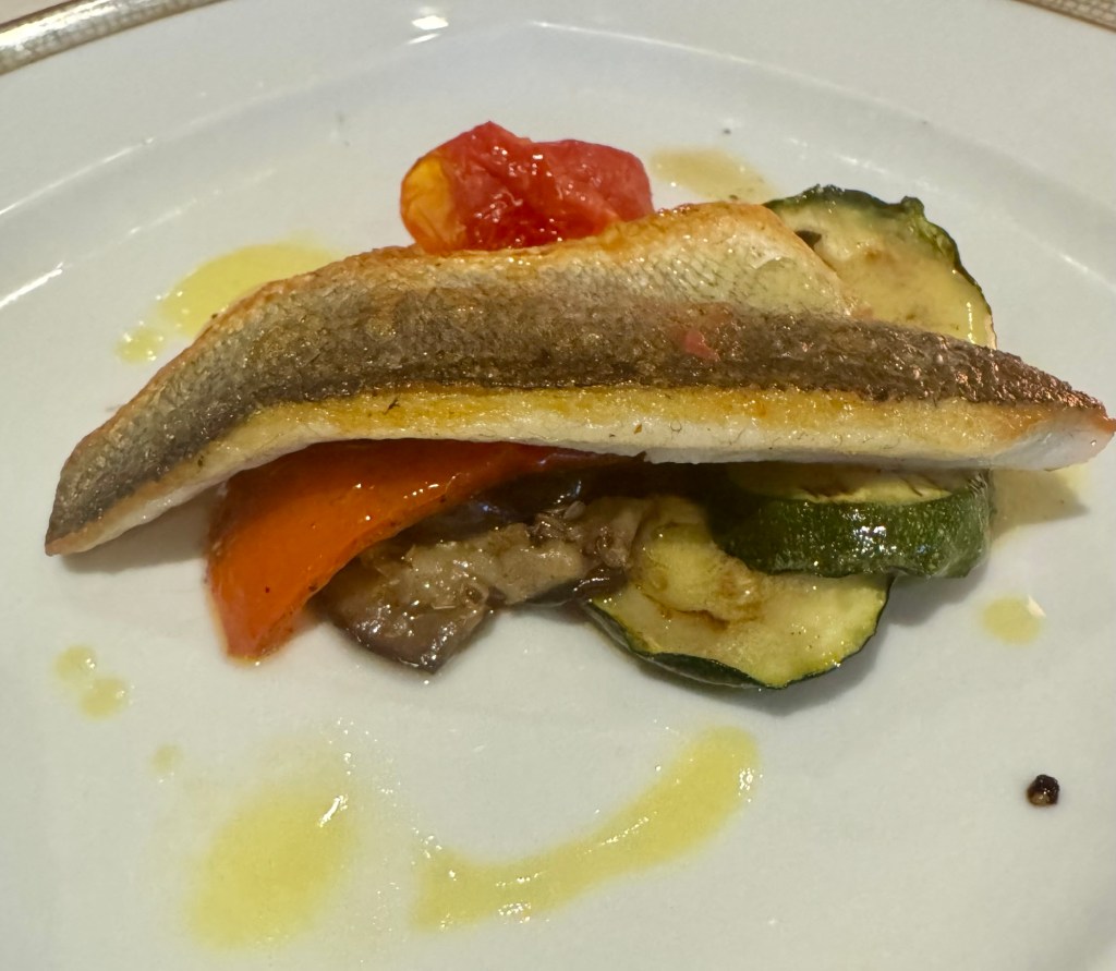 Hi Again Gang! Tonight we ate in the Italian Specialty restaurant called La Terrazza and had a nice dinner. They always start you off with an amazing charcuterie board which could almost be enough for dinner… but not on a cruise! Lol. We dove into it so quick I forgot to take a picture! To add to that I had the Dall’Orto (vegetable ragu, eggplant, sweet peppers and sardines) as my first appetizer and lasagne as my second. For my main I had the Sea Bass. For dessert I had the Dark Chocolate Cake. Everything was so tasty!