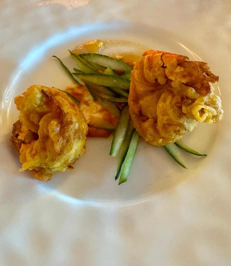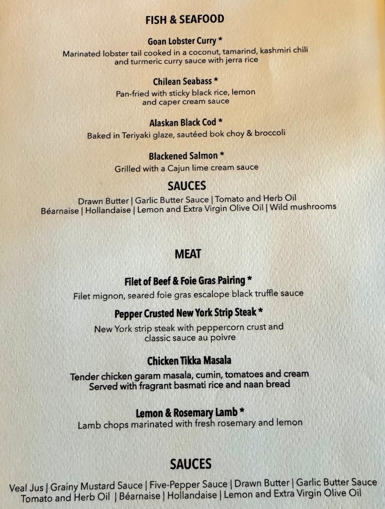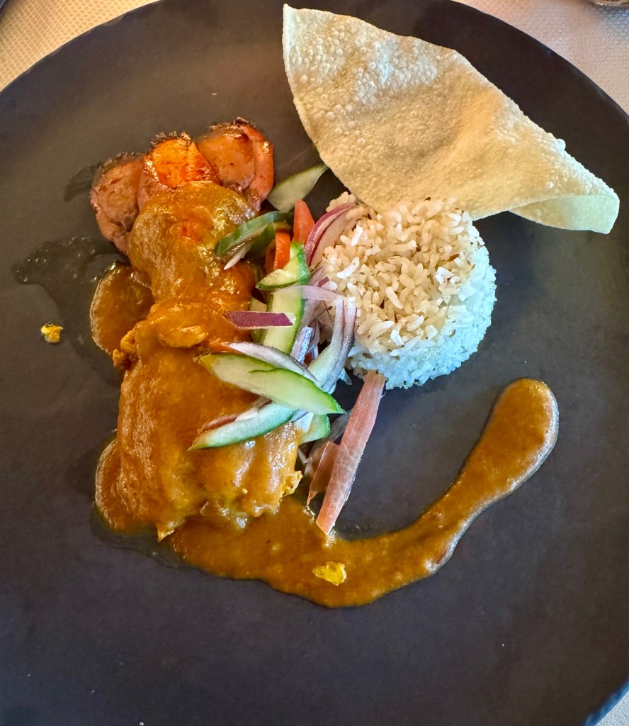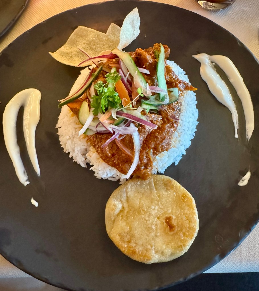 I started out boring with the crab cake as my first appetizer but then jumped right in with the King Prawn Pakora with the Curry Sauce for my second appetizer. For my mains I actually tried two (but didn’t eat all of both!) which were the Goan Lobster Curry (of course!) as well as the Chicken Tikka Masala, both of which packed a punch! I was ready to order a glass of milk to calm my taste buds! Lol. For dessert I had the Caramel Orange Praline bar which was yummy and also helped with my flaming taste buds!