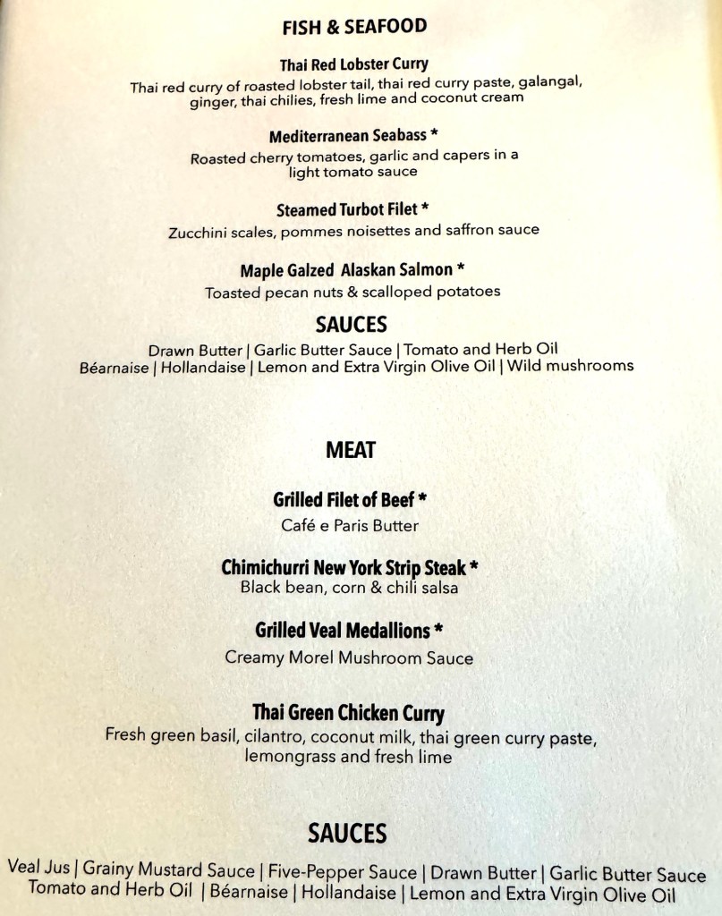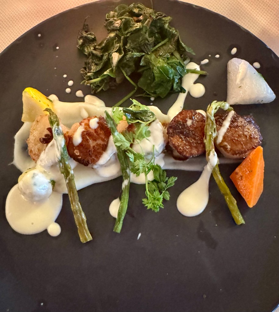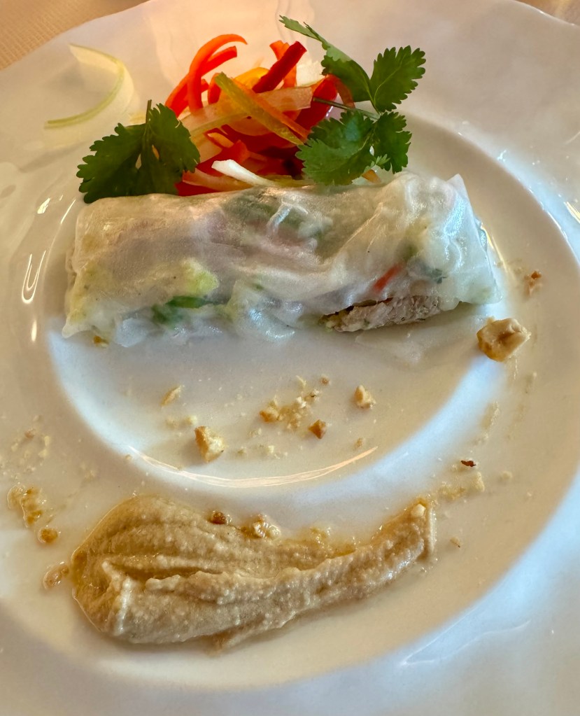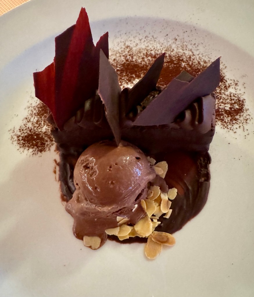 We started with dinner at Atlantide. We both had the same starters of the Water Paper Rolls first and the Thai Lettuce Wraps as the second. For our mains I got the Grilled Scallops and Kathy got the Veal Medallions. For dessert I had the All Chocolate Bar and Kathy special ordered the Peanut Bar from last night and they had it for her. Everything as always was excellent.