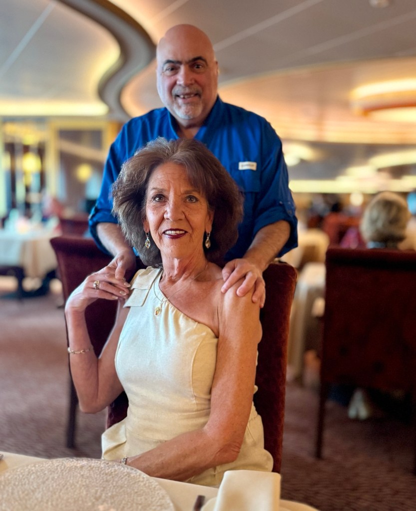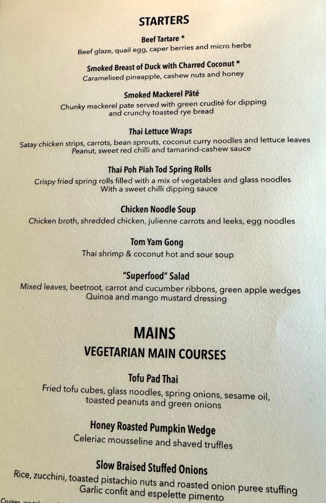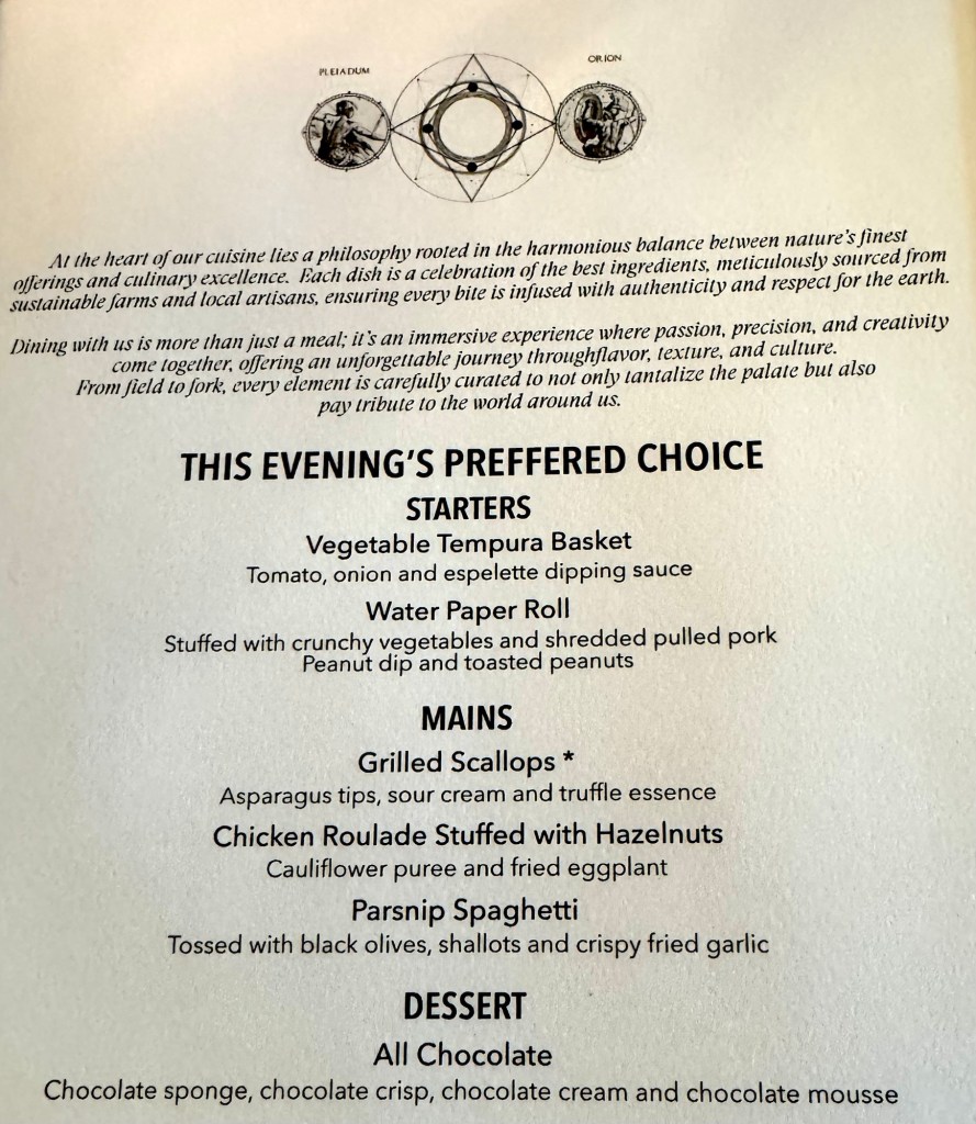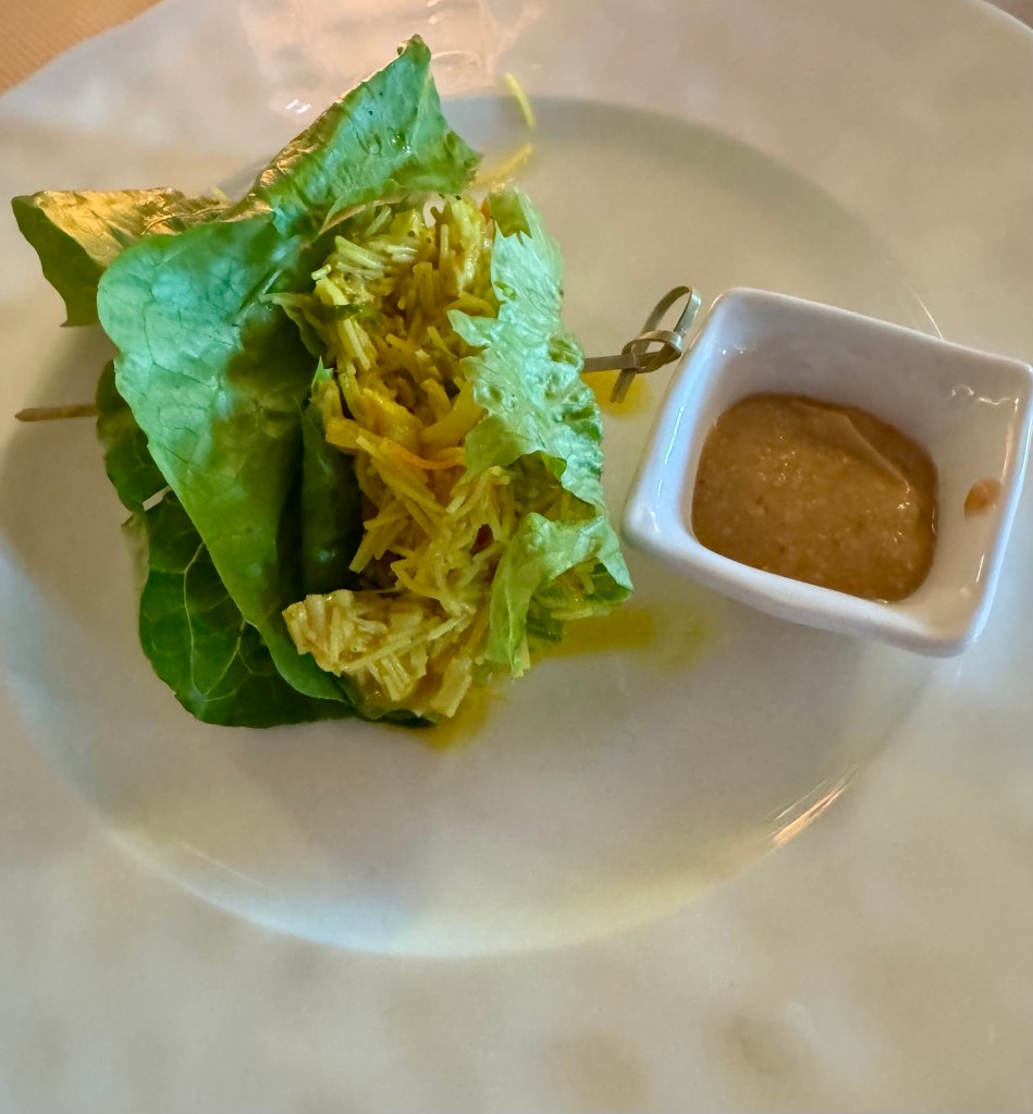 We started with dinner at Atlantide. We both had the same starters of the Water Paper Rolls first and the Thai Lettuce Wraps as the second. For our mains I got the Grilled Scallops and Kathy got the Veal Medallions. For dessert I had the All Chocolate Bar and Kathy special ordered the Peanut Bar from last night and they had it for her. Everything as always was excellent.