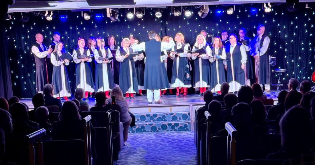 After dinner we went to the coolest show. They brought in the Tallinn Mixed Choir to sing lots of their local songs in their language which were all very beautiful. They even sang several songs they did at the Estonia Song Festival location that we visited. But the most emotional song they did was part of The Singing Revolution that even the Soviet KGB couldn’t shut down and led to their independence. So powerful! They even did one song in English which was Leonard Cohen’s Hallelujah which the whole crowd sang along to. Such fun!