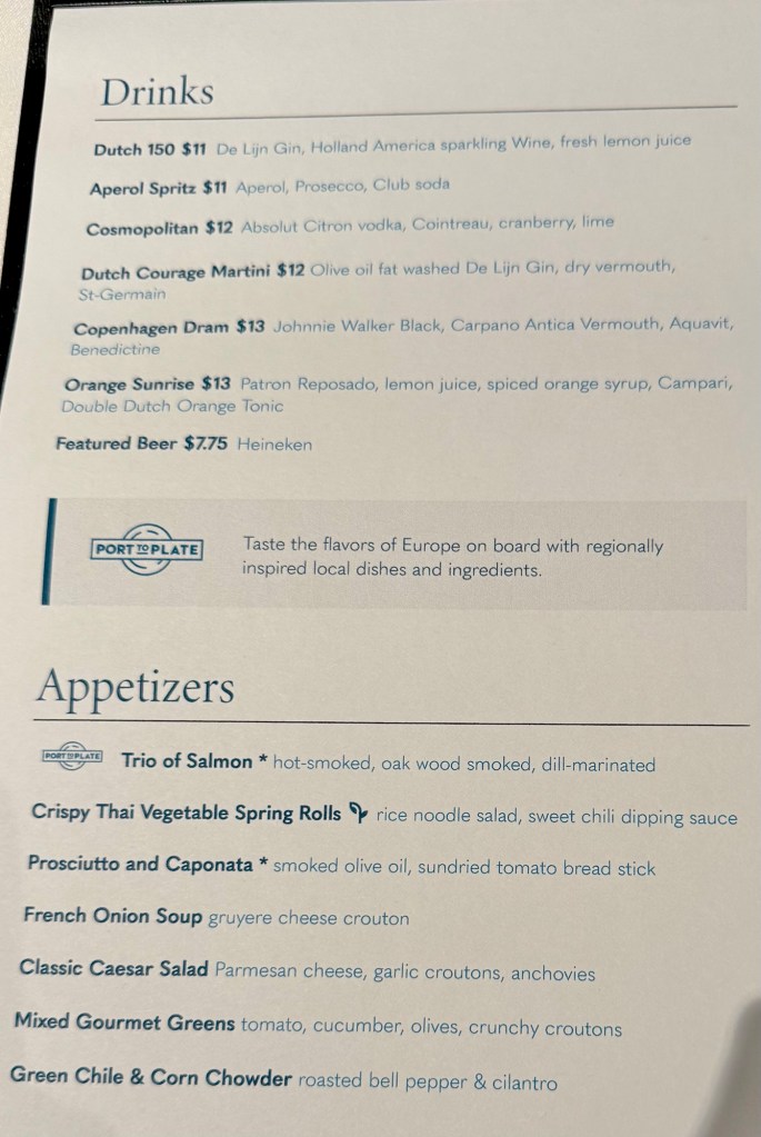 Hi Again All! We had a great first night. We ate in the Main Dining Room via their “anytime” dining (vs fixed time dining) so you can come anytime between 5:00 and 9 PM. We got there about 7:30 and got a table right away. We tried to get our head waiter Gerald and asst waiter Chad again from our last cruise but their tables were full so we had another good waiter named Tony.