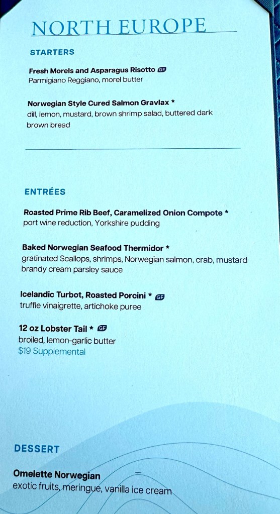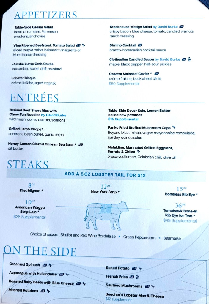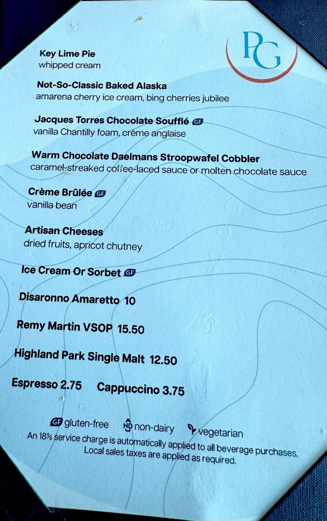 Hi Again Gang! We had an amazing dinner tonight. We went to the Pinnacle Grill, which is one of their specialty restaurants, this one being a steakhouse. As they say, “When in Rome”… so steak/beef it was!