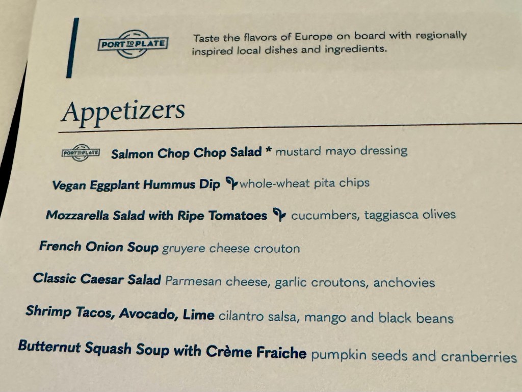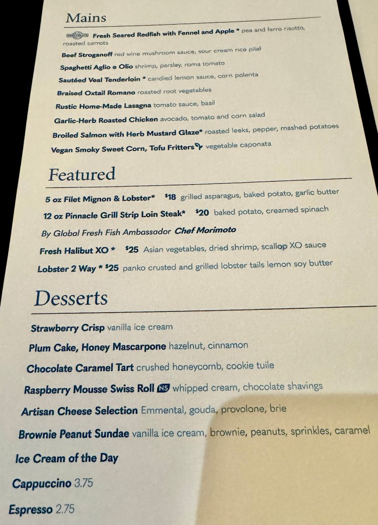 Hi Again Gang! We’re getting spoiled with night after night of a great experience. We started with dinner at the Main Dining Room. I went with another all seafood dinner. I started with the Salmon Chop Chop Salad for my first starter and the Shrimp Tacos for my second. For my main I had the Red Snapper and for dessert I had the Chocolate Caramel Tart. Everything was soooo yummy!