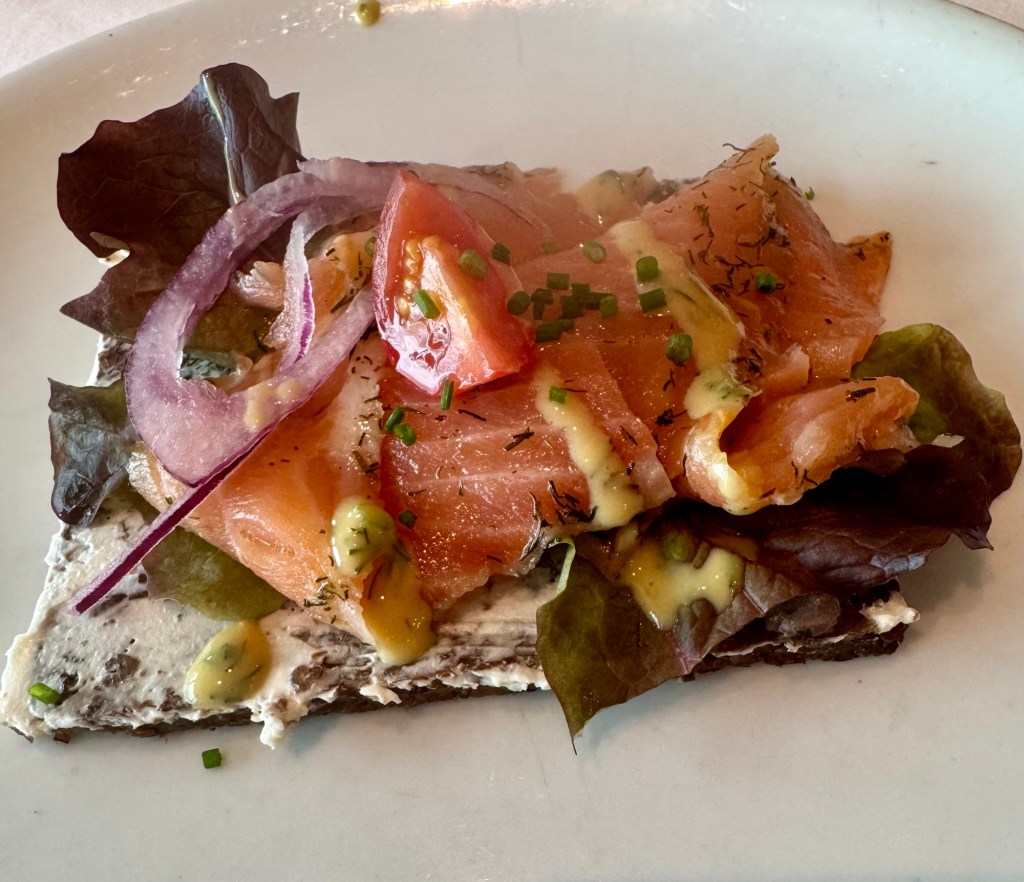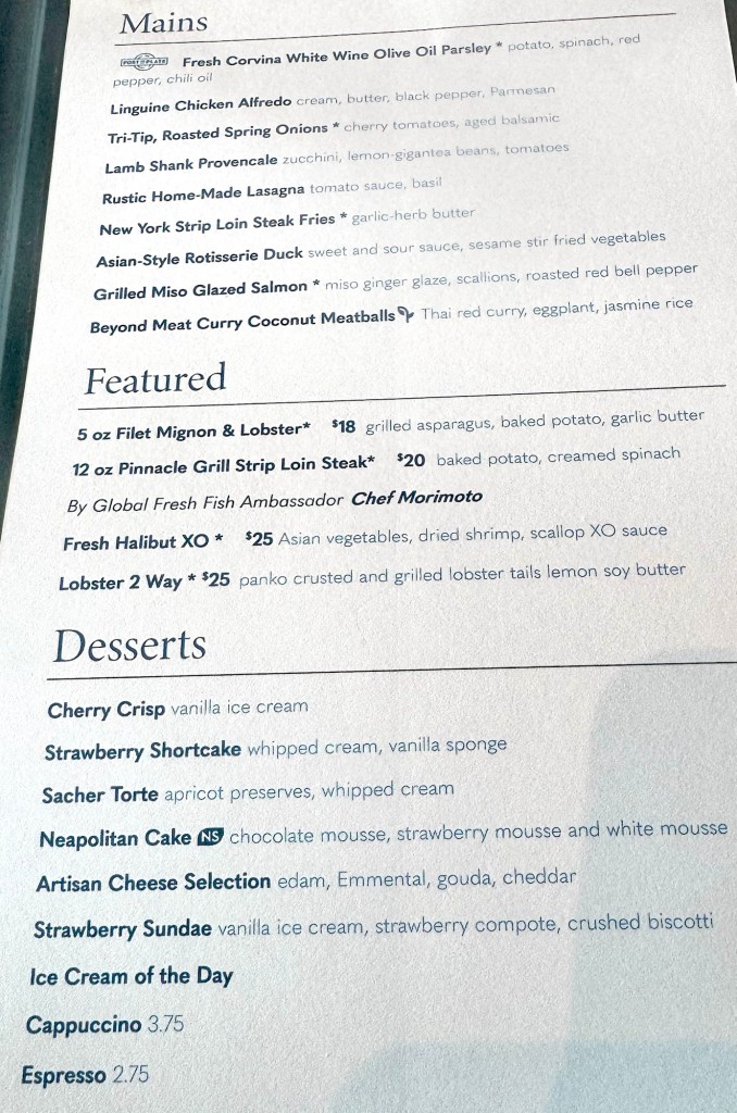 Hi Again All! Well as they say, wash, rinse, repeat and the great evenings keep repeating. Good food, good entertainment and good music. Can’t beat it! We started off with dinner in the Main Dining Room. For my starters I had the Salmon Gravlax for my first one and the Grilled Pineapple with Honey-Ricotta for my second. For my main I had the Grilled Miso Glazed Salmon (love the Miso flavor!) and the Sacher Torte for dessert. All were a big hit!