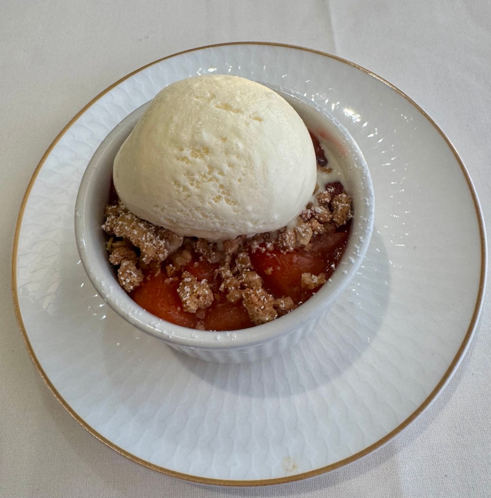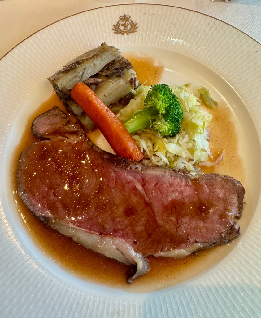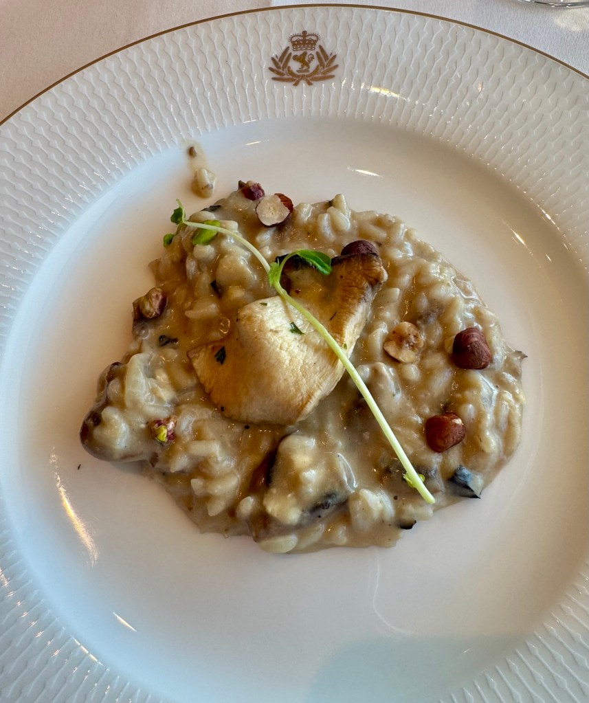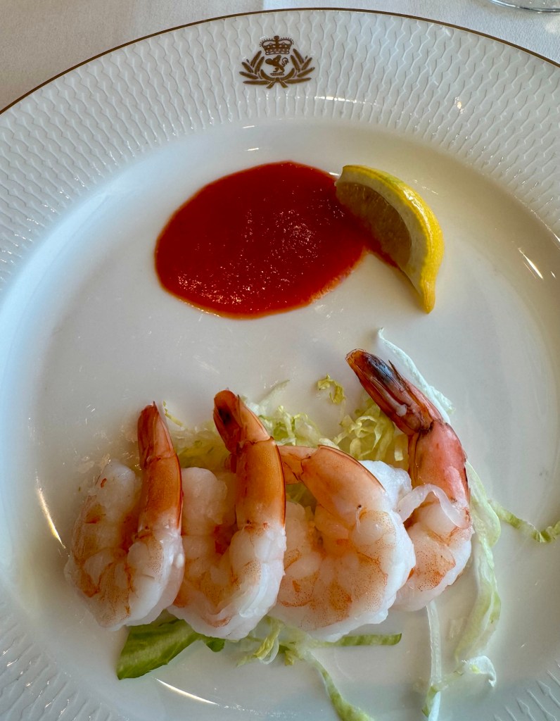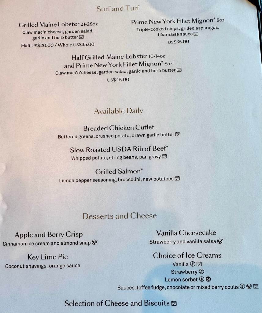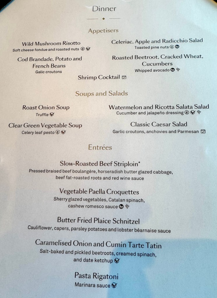The dinner menu to be honest is no Regent Seven Seas (where’s the free everyday lobster when you need it??) but we found things we liked. I got the Wild Mushroom Risotto and Shrimp Cocktail for starters and the Slow-Roasted Beef Striploin for the main and the Apple and Berry Crisp for dessert.