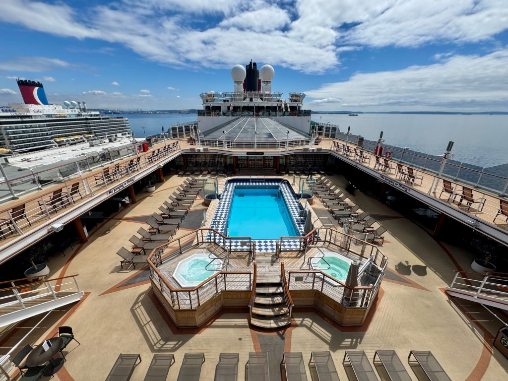 We slept well and got the shuttle to the pier. It was a little longer wait to board (we’re spoiled with the small luxury ships we usually do or having priority on the others) but it was all good. We were at the Lido having lunch by 1:15 which was not bad since we left the hotel at 11:15 and it was a 40 min bus ride to the pier.
