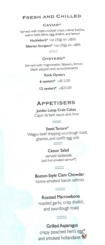 Hi Again Gang! So tonight I think we found the restaurant that makes Cunard start to feel more like a luxury cruise line (but with a caveat that I’ll mention below). We had dinner in the specialty restaurant named The Verandah. I got it for Kathy’s birthday and the menu and food was much better than the Britannia.
