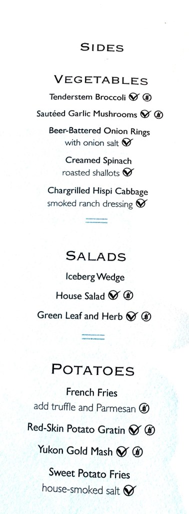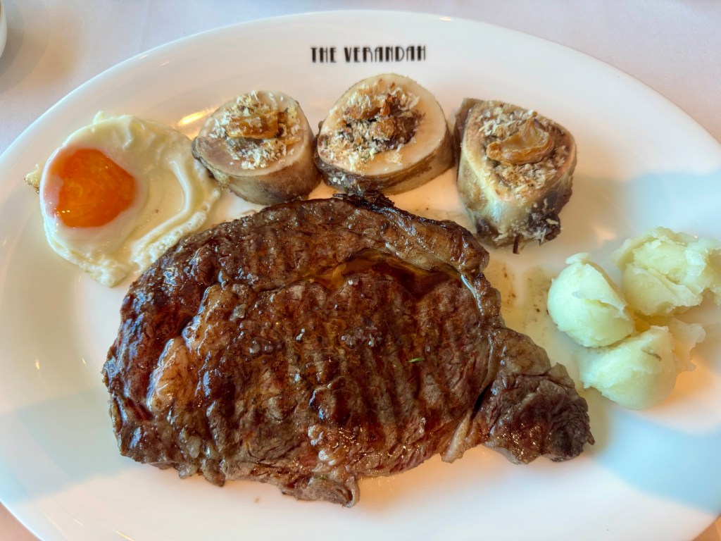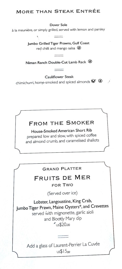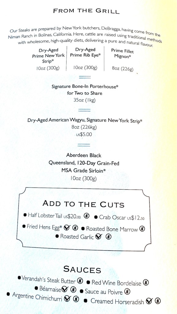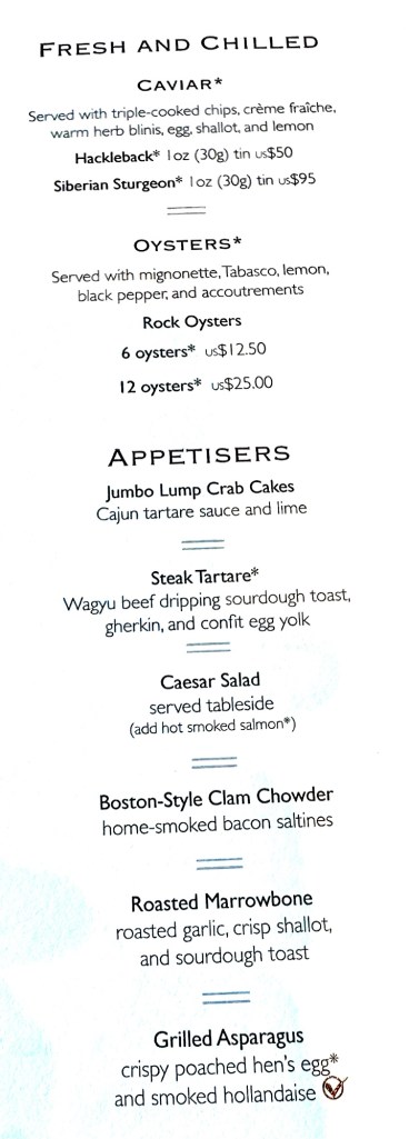 Their specialty is steaks but they have lots of other nice options as you can see on the menu pic. So if they’re good at steaks we figured why not order a steak! And since we paid extra for this we wanted to strap the feed bag on and get our money’s worth! So I had the Crab Cake for my starter, the Rib Eye with a Hen’s Egg and Roasted Bone Marrow (yes, Bone Marrow!) for my Main and the Dark Chocolate Fondant for my dessert. (But the caveat that I feel “cheapened” the experience was they only allowed one appetizer. Heck even the free Britannia restaurant allows two appetizers!).