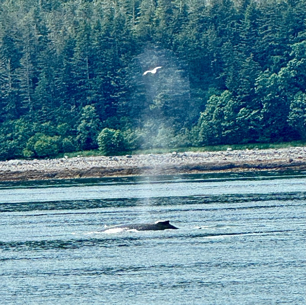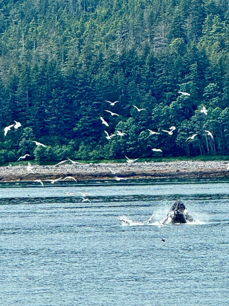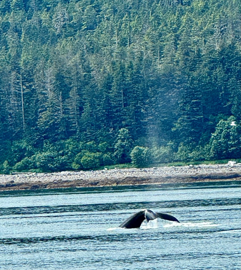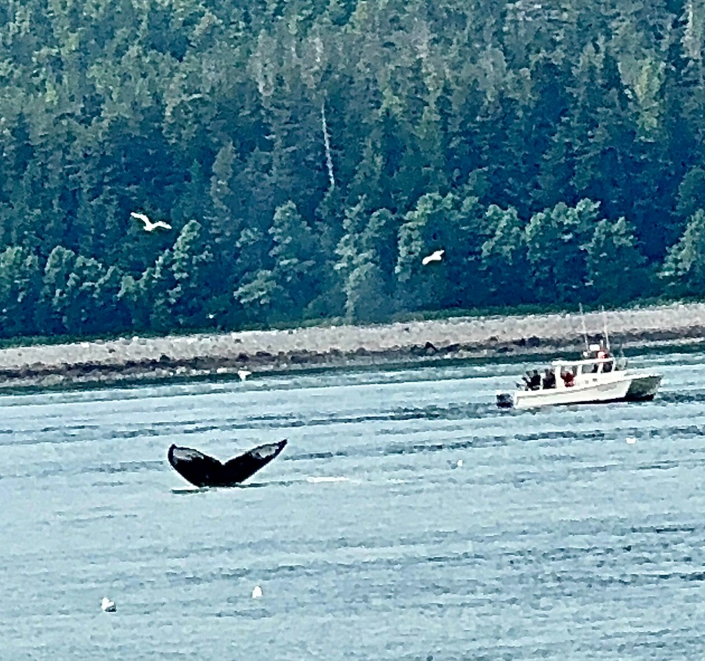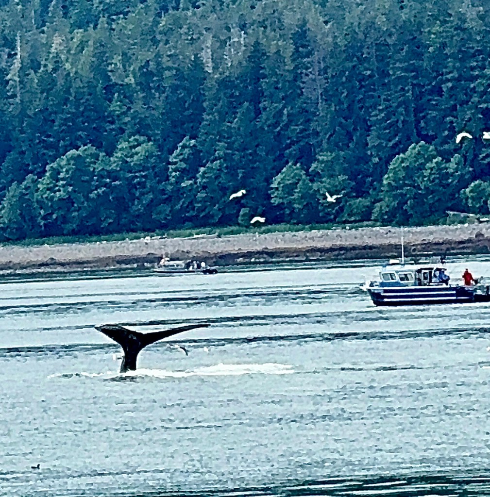 Hi All! The word of the day is WHALES!! We were in Juneau, Alaska today and did a whale watching tour and boy did we see whales! And they give them all cute names. We saw Kelp, Riddler, Juneau and her little calf Fritz and we saw others but they didn’t break the water line high enough for them to know who they were.