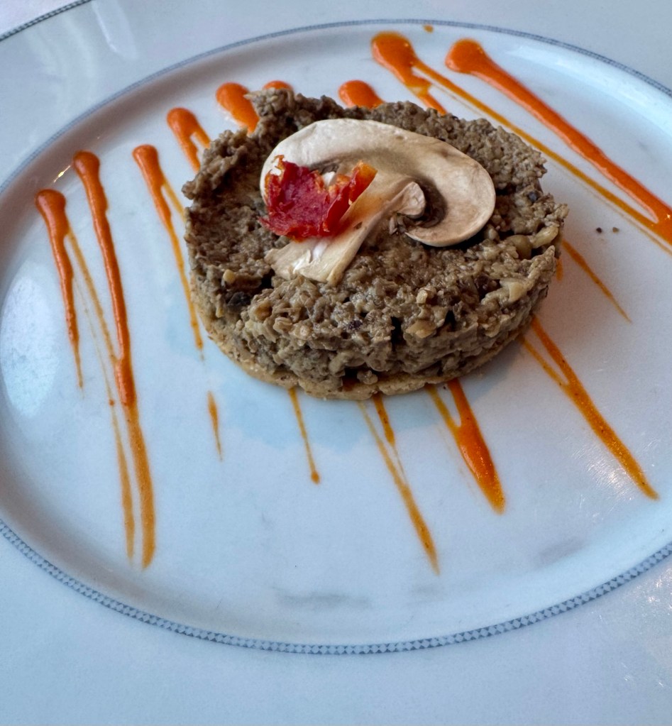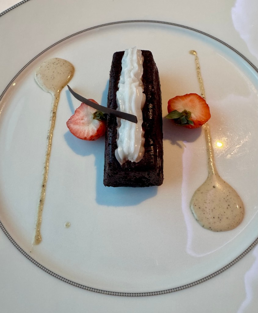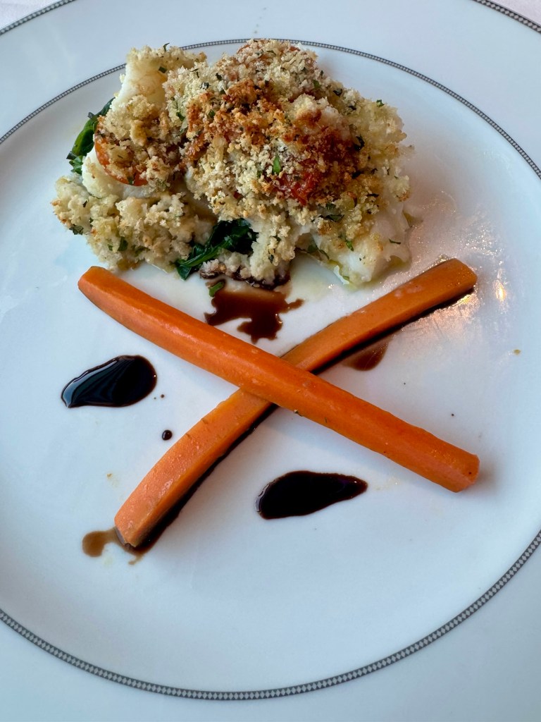 For my two starters I got the Mushroom Tart and the Celery Root Bisque. For my main I had the Mediterranean Crusted Cod Filet. Then for dessert I got the Chocolate Brownie. Tonight’s meal was so much lighter than last nights but was also very tasty!