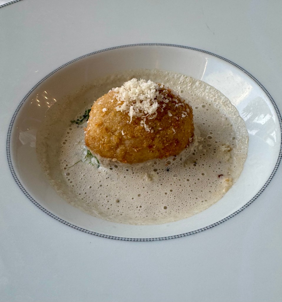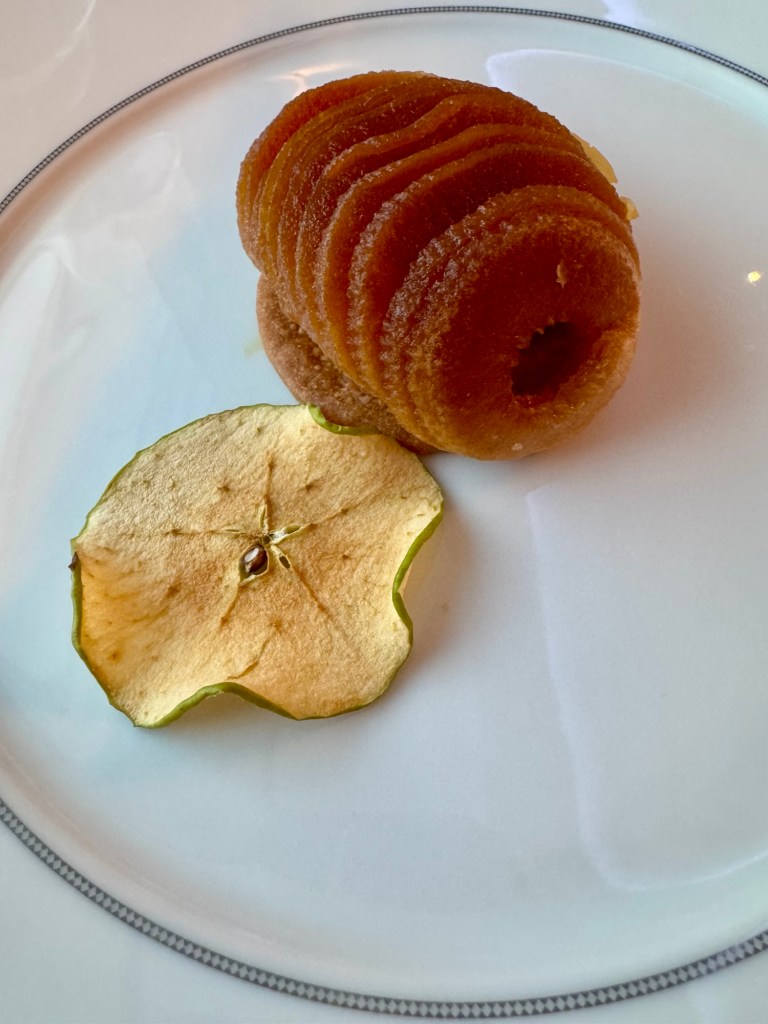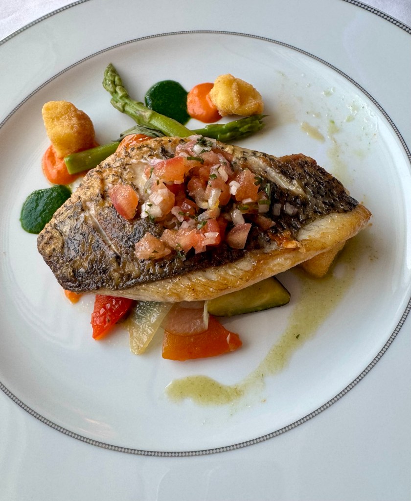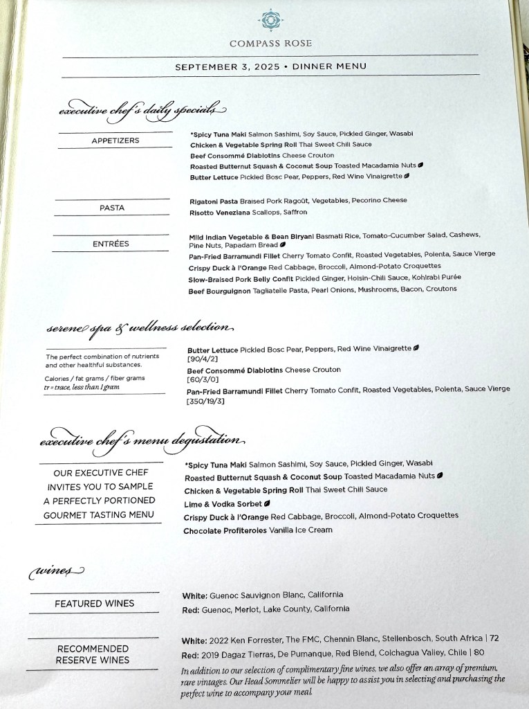 Tonight we had dinner again in Compass Rose and got to sit at one of our favorite tables with our favorite waiters. And while we love that consistency we also love that they change the menu every night. Tonight I had the Norwegian Gravlax and the Panko Crusted Poached Egg for my two sides. For my main I had the Barramundi Fillet. Then for dessert I had the Golden Baked Apple. As always, everything was very tasty!
