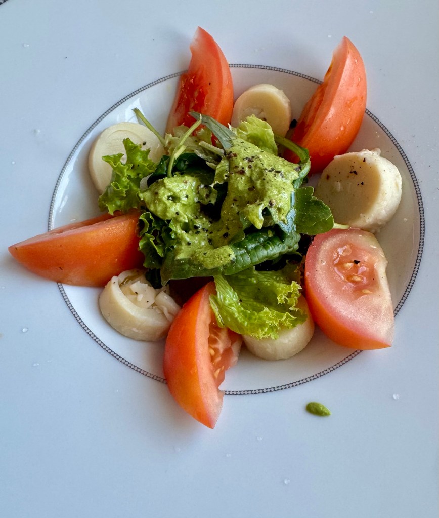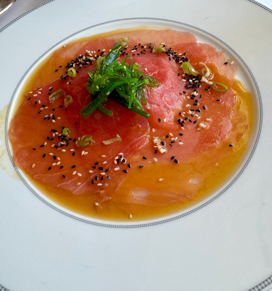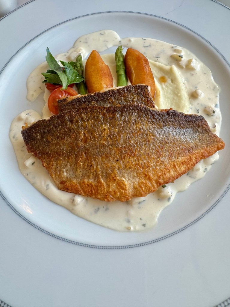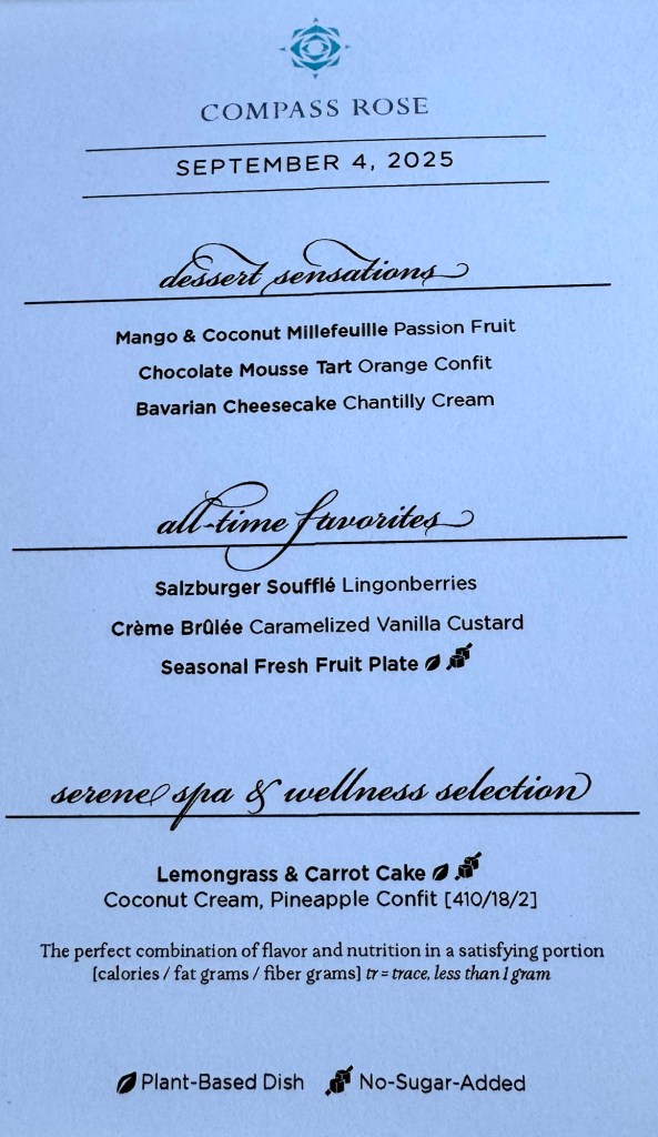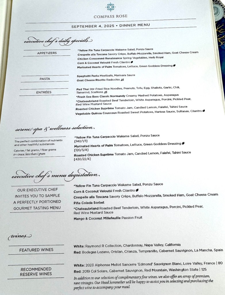 Hi Again All! Well the beat goes on… another great night tonight. We started with dinner in Compass Rose. I got the Yellow Fin Tuna Carpaccio as well as the Marinated Hearts of Palm Salad for my starters. For my main I had the Fresh Sea Bass and for dessert I had the Cheese Plate. As always everything was delicious.