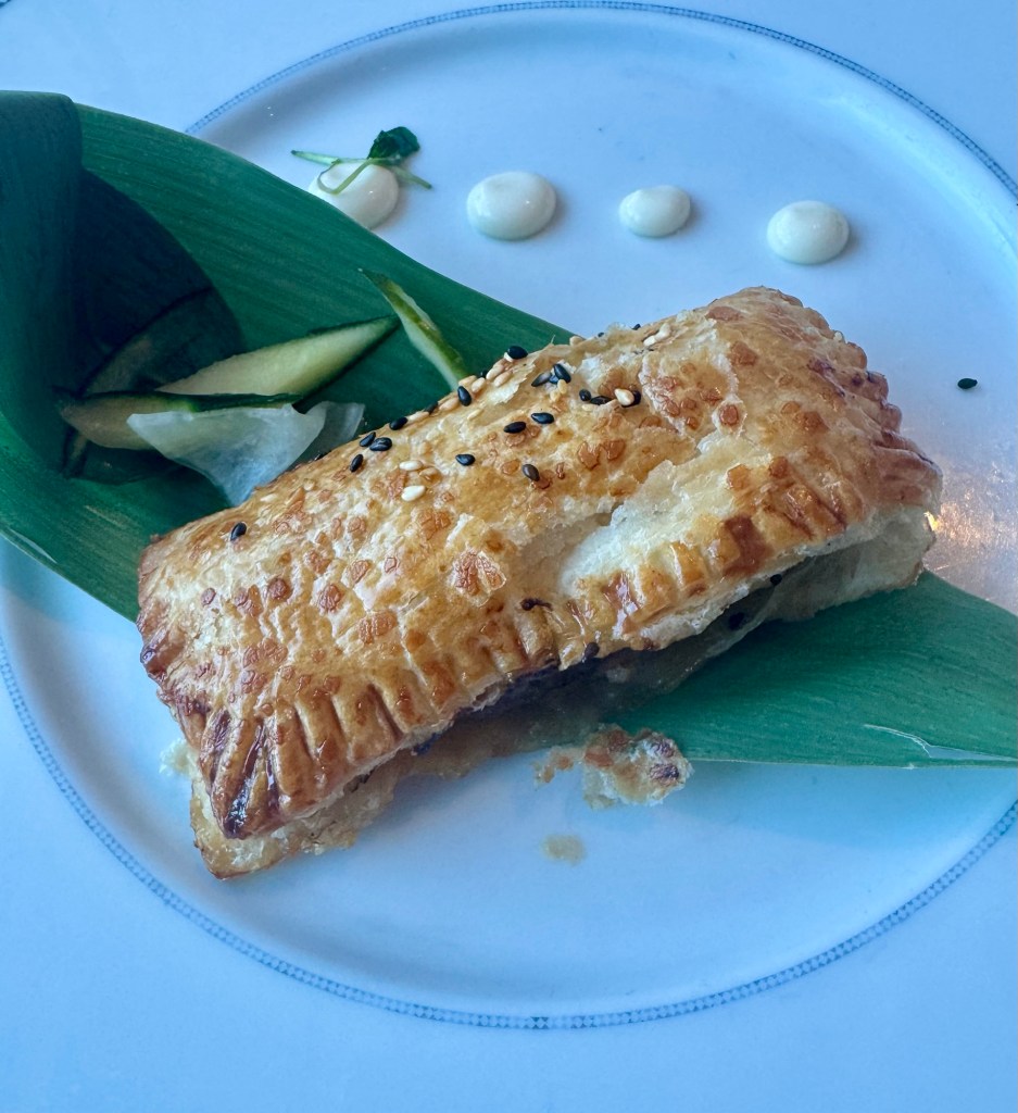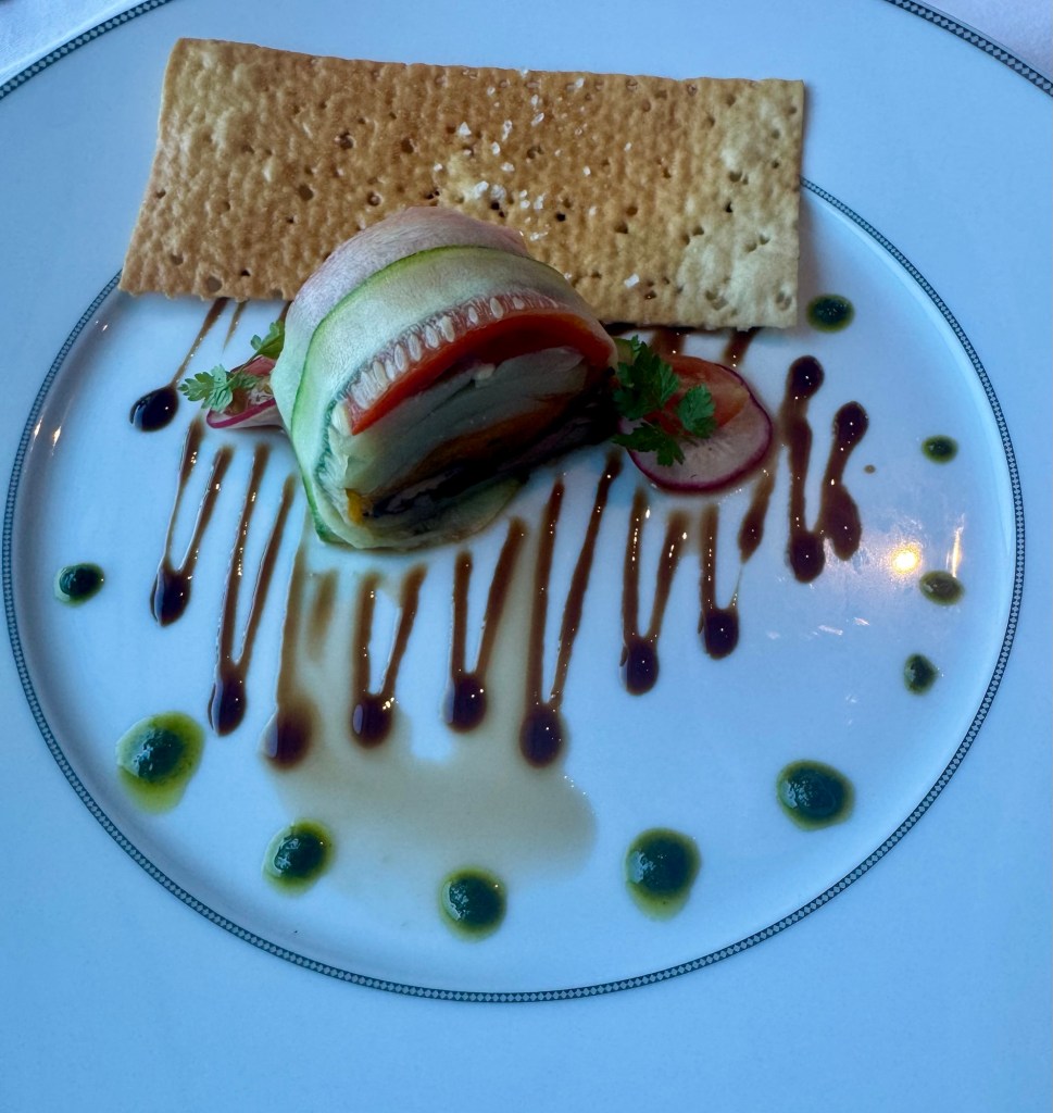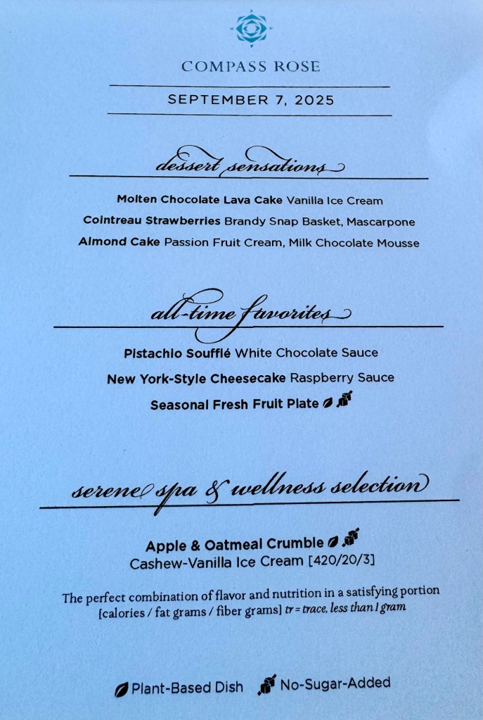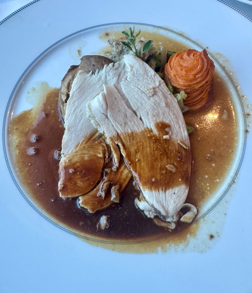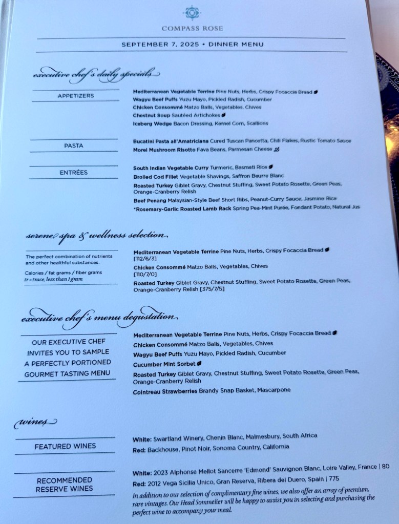 We had dinner tonight in Compass Rose with our favorite waiters Mary Jane and Okee again. We missed them last night! For my two starters I had the Mediterranean Vegetable Terrine and the Wagyu Beef Pastry. For my main I had Thanksgiving dinner! Roast Turkey, stuffing and sweet potatoes… is it November yet?? For dessert I had the Apple and Oatmeal Crumble. All were amazing!